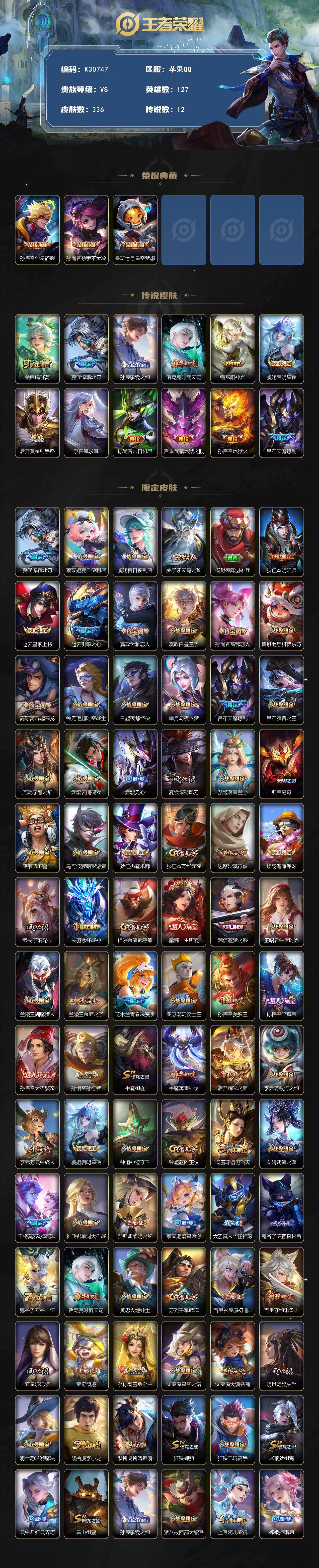 苹果Q-V8-至尊星耀V段位-127英雄-336皮肤-3典藏皮肤-12传说-96史诗