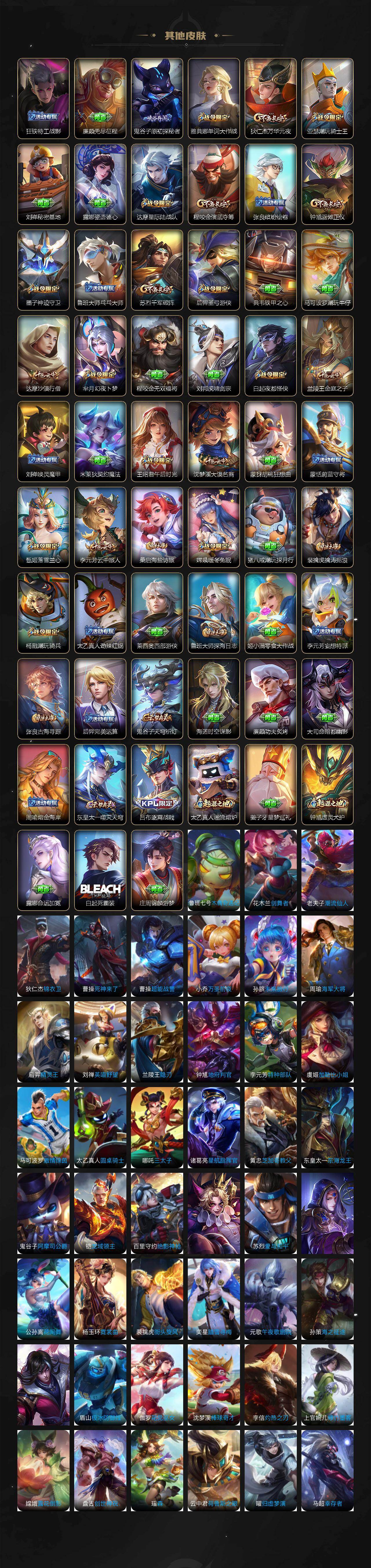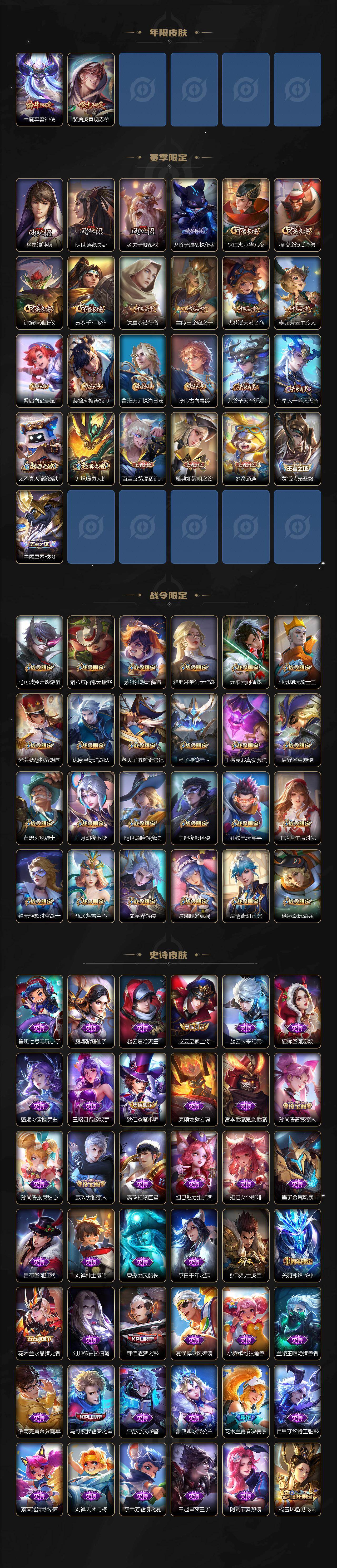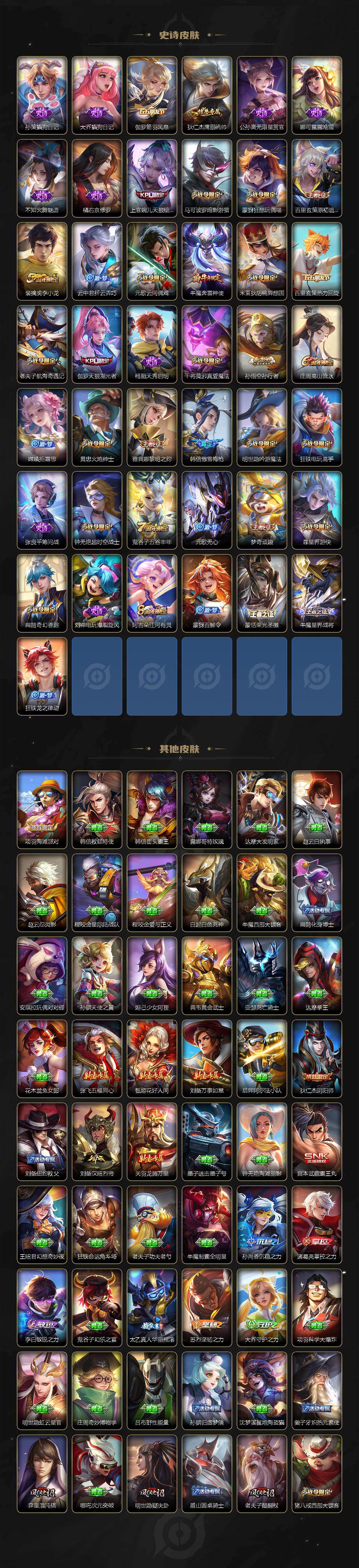 【限定皮肤】:狄仁杰阴阳师,赵云皇家上将,墨子神迹守卫,嬴政优雅恋人,孙尚香蔷薇恋人,庄周高山流水,钟无艳超时空战士,扁鹊奇幻香踪,白起夜都怪侠