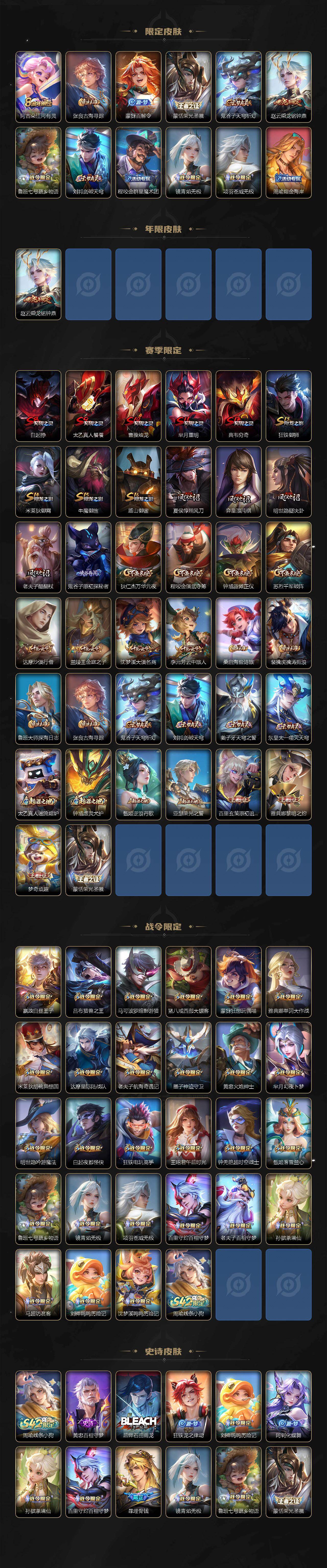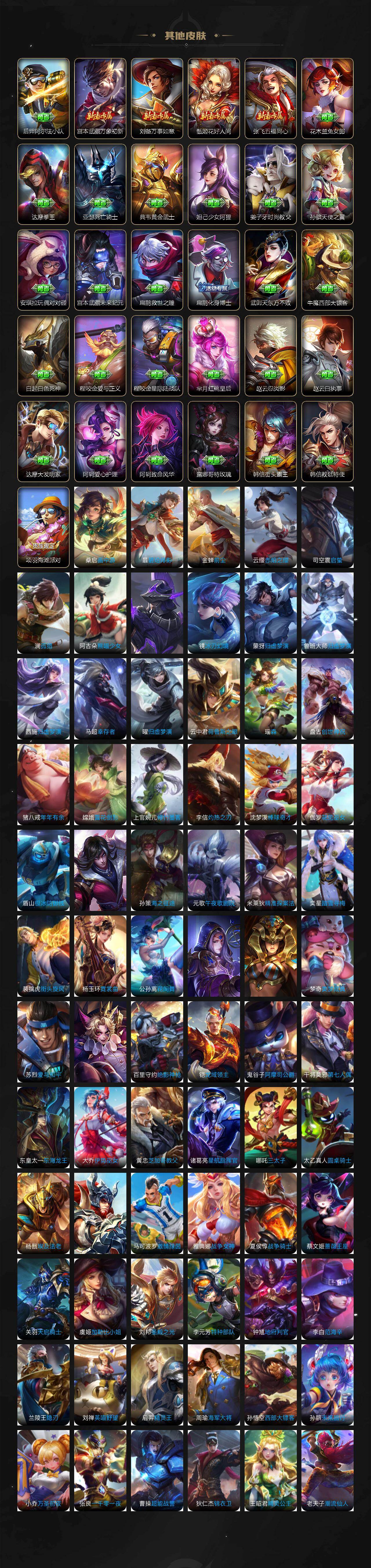 【传说皮肤】:赵云乘龙铭钟鼎,李白诗剑行,不知火舞绯月行,马超无双飞将,大乔挚爱花嫁,孙策挚爱之约,孙策末日机甲,曜李逍遥 ,虞姬启明星使,曜云鹰飞将,李信一念神魔,貂蝉猫影幻舞,干将莫邪久胜战神,花木兰冠军飞将,诸葛亮武陵仙君