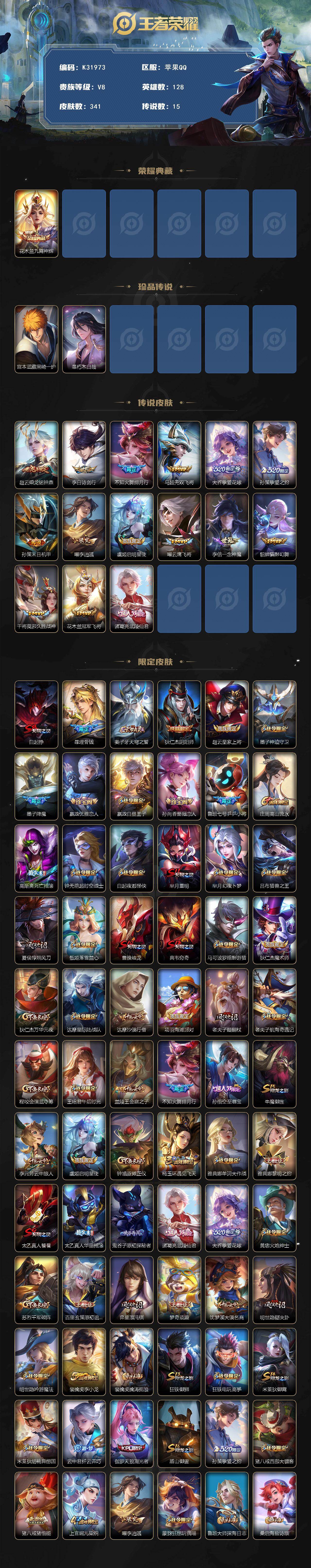 苹果Q-V8-至尊星耀III段位-128英雄-341皮肤-1典藏皮肤-2珍品传说-15传说-93史诗