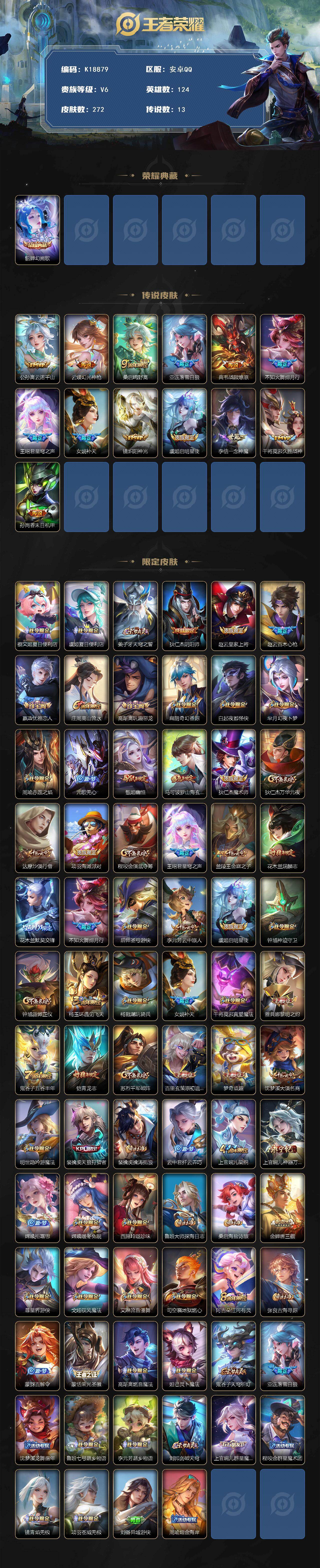 安卓Q-V6-永恒钻石I段位-124英雄-272皮肤-1典藏皮肤-13传说-94史诗