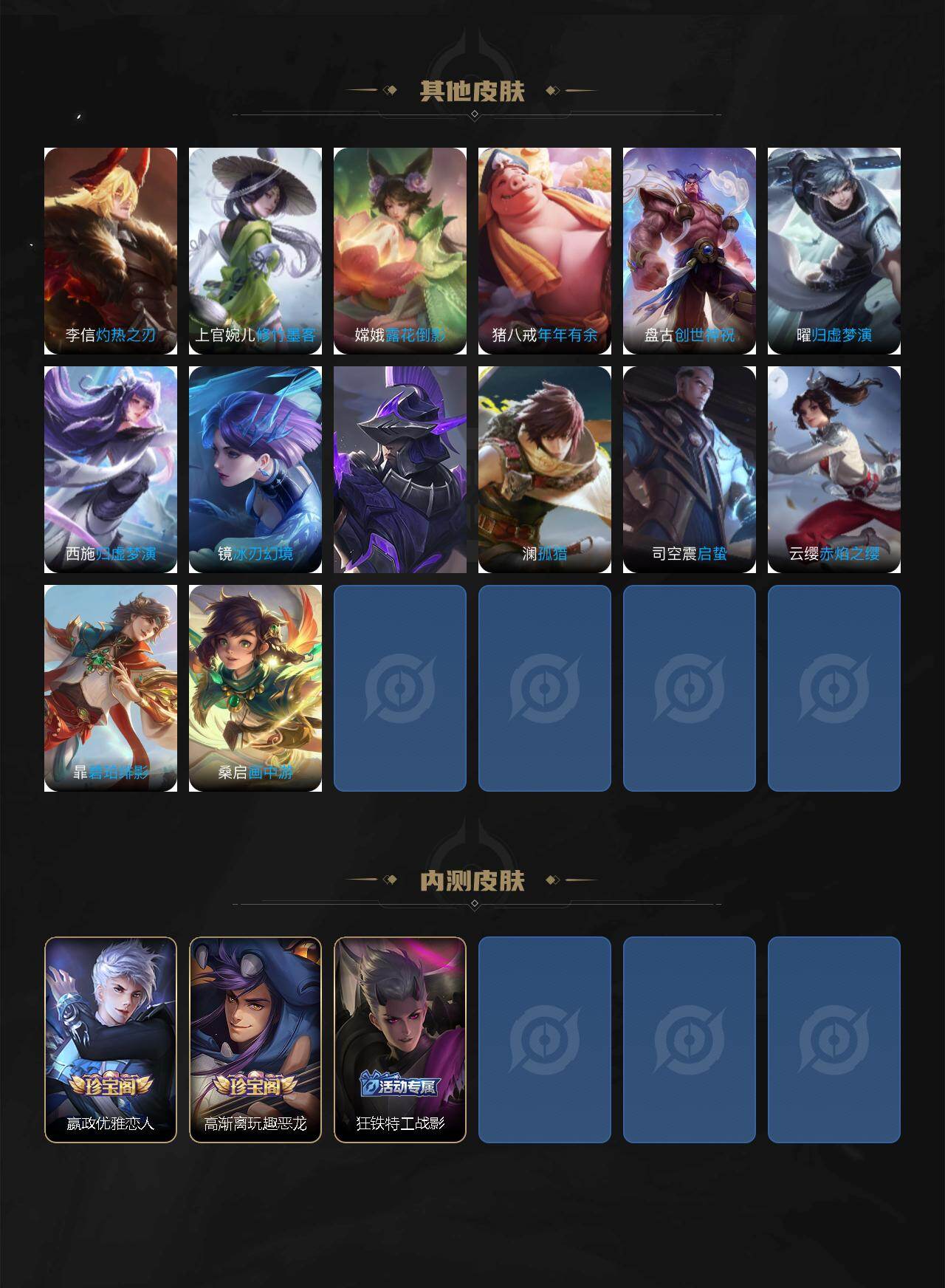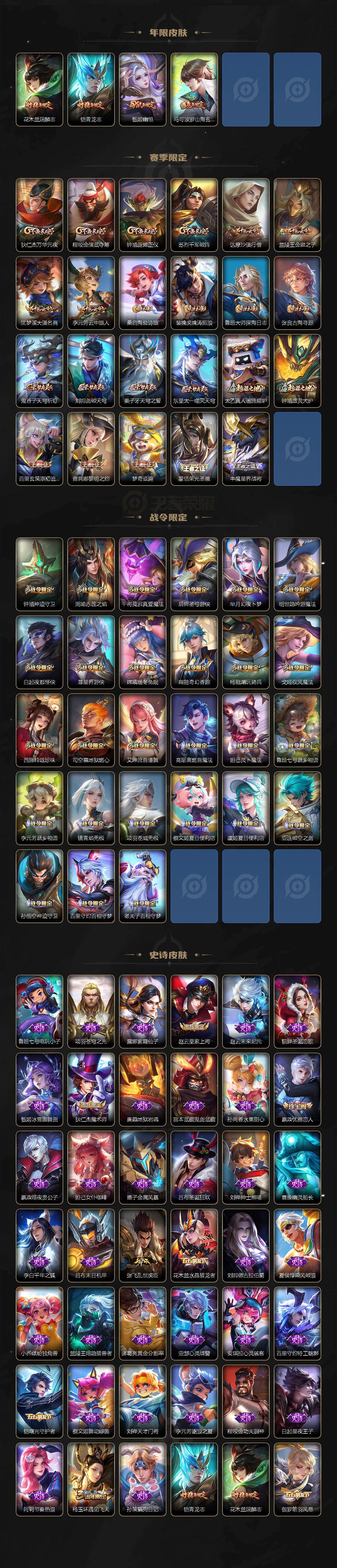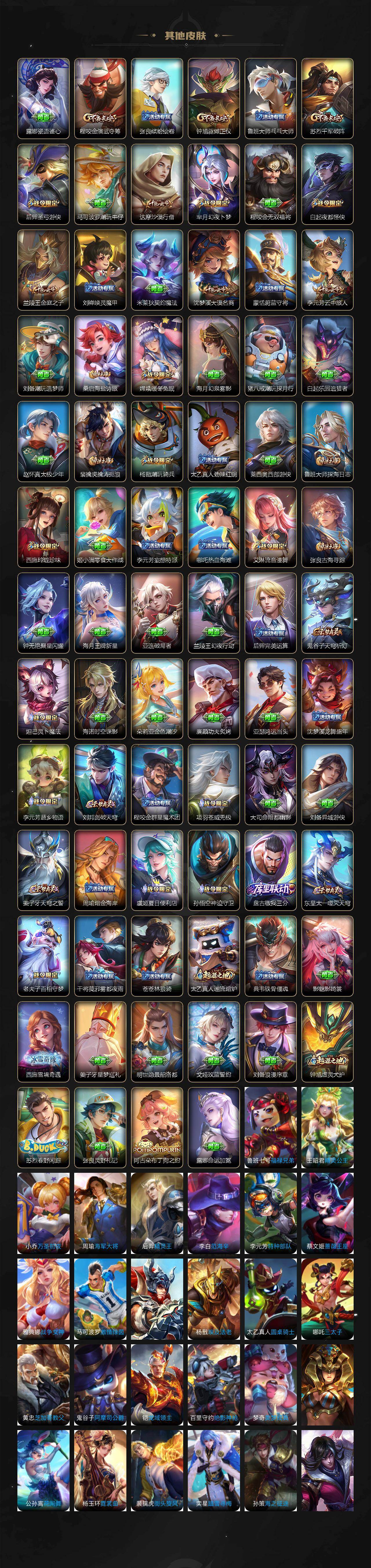 【限定皮肤】:蔡文姬夏日便利店,虞姬夏日便利店,姜子牙天穹之誓,狄仁杰阴阳师,赵云皇家上将,赵云百木心枪,嬴政优雅恋人,庄周高山流水,高渐离玩趣恶龙,扁鹊奇幻香踪,白