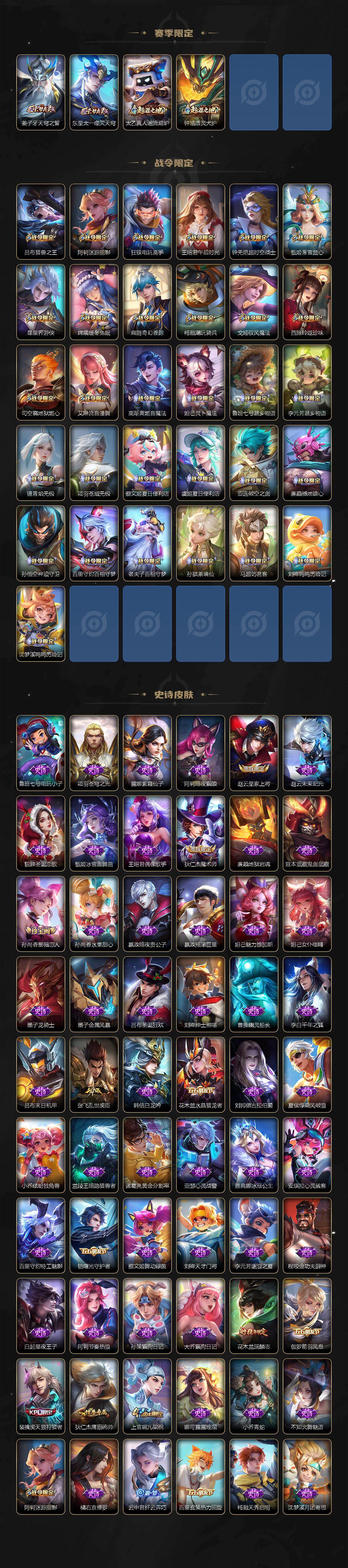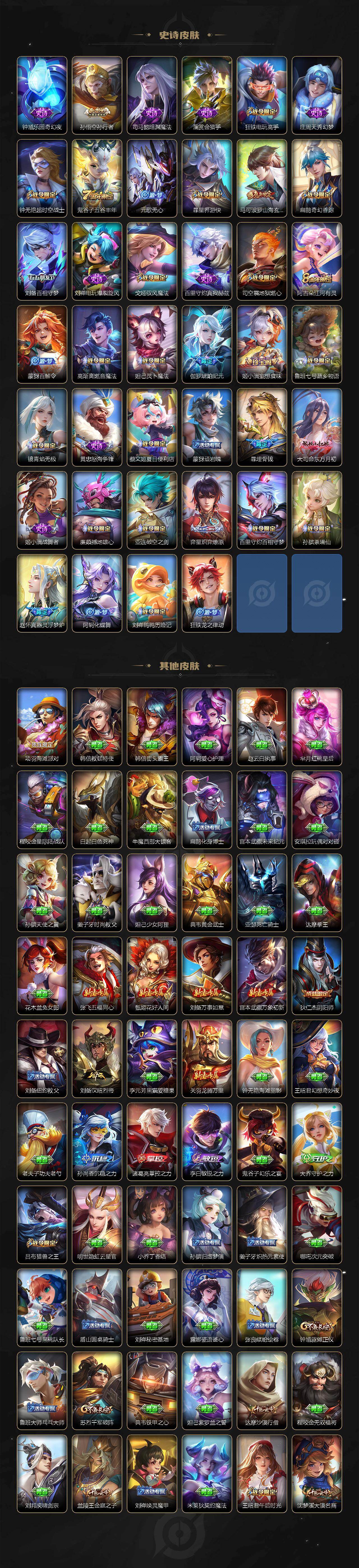 【传说皮肤】:云缨幻光神枪,桑启鸣野蒿,夏侯惇霜北刀,典韦战鼓燎原,李信山海炽霜斩,后羿无尽星芒,孙策末日机甲,铠绛天战甲,虞姬启明星使,孙悟空零号赤焰,曜云鹰飞将,刘备时之恋人