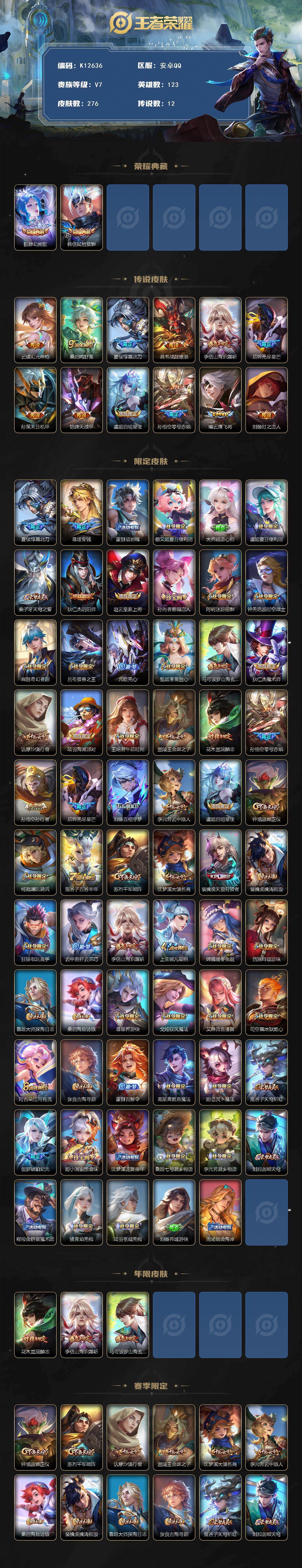 安卓Q-V7-至尊星耀IV段位-123英雄-276皮肤-2典藏皮肤-12传说-99史诗