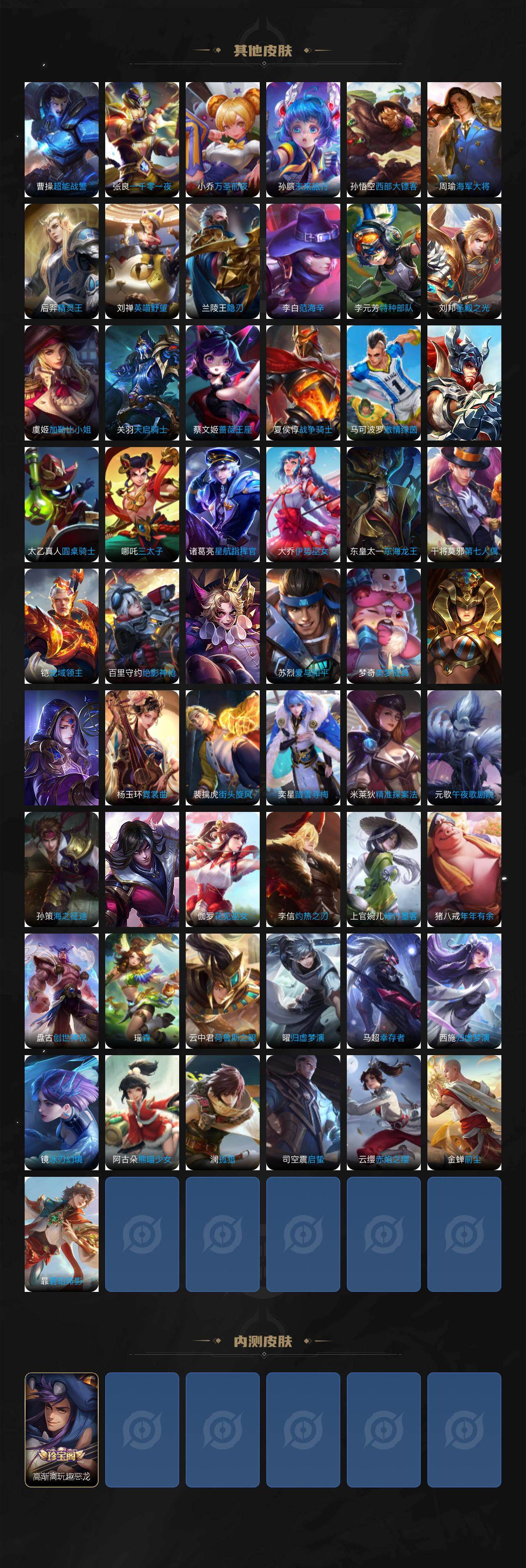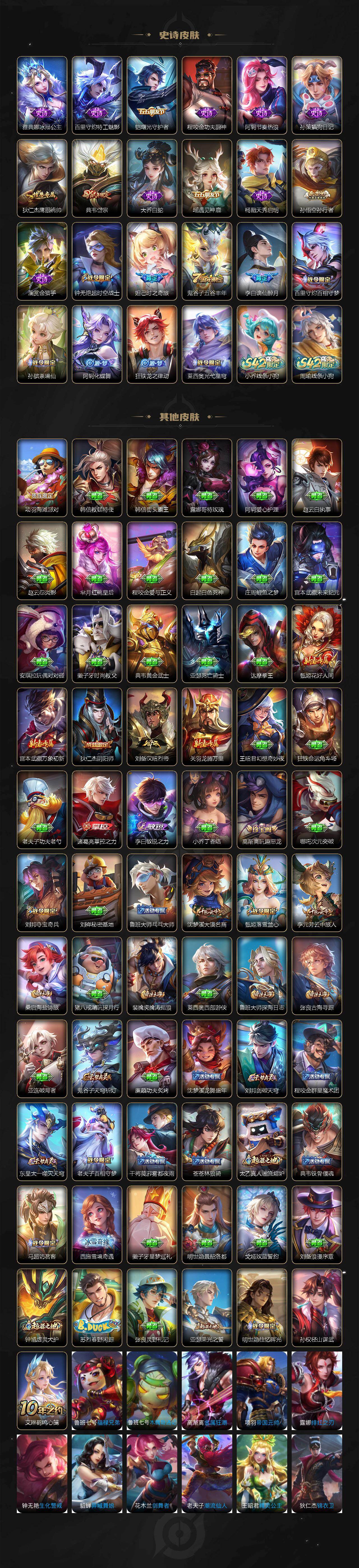 【传说皮肤】:后羿神树通天,澜逐花归海,王昭君星穹之声,百里守约碎云,橘右京枫霜尽,马超无双飞将,孙策末日机甲,赵云淬星耀世,铠绛天战甲,虞姬启明星使,曜云鹰飞将,李信一念神魔,后羿黄金射手座,貂蝉仲夏夜之梦,宫本武藏地狱之眼,孙悟空地狱火,狄仁杰超时空战士