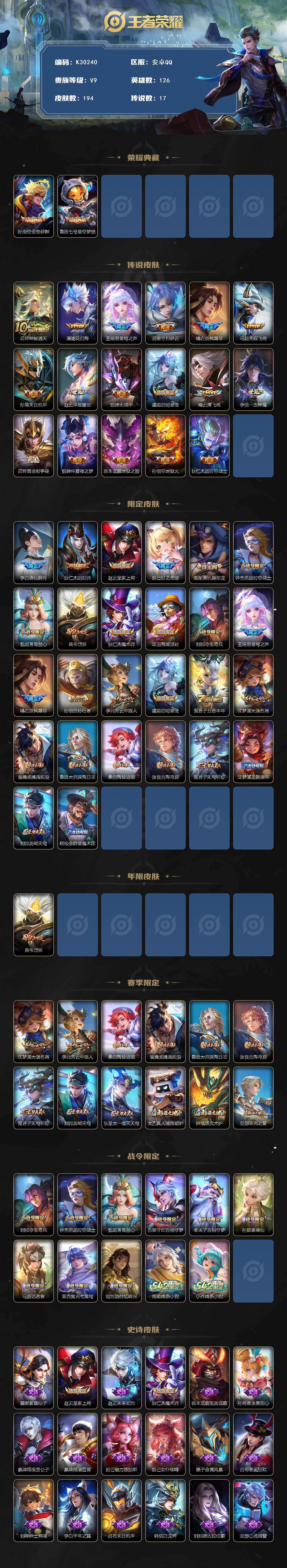 安卓Q-V9-永恒钻石I段位-126英雄-194皮肤-2典藏皮肤-17传说-41史诗