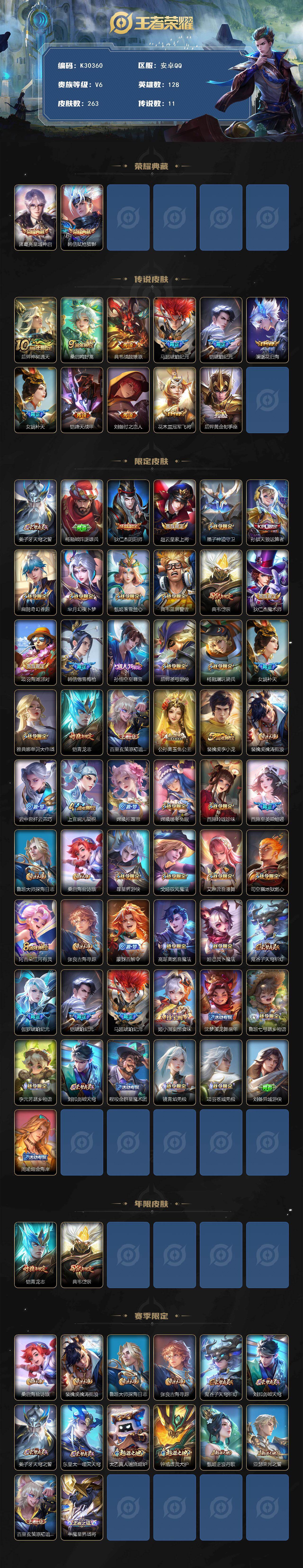 安卓Q-V6-至尊星耀V段位-128英雄-263皮肤-2典藏皮肤-11传说-54史诗