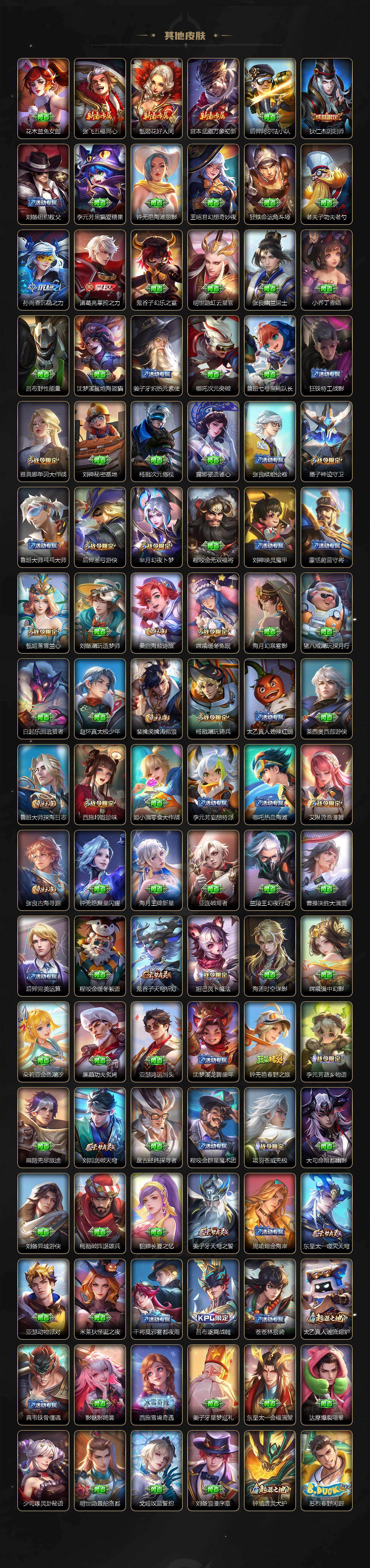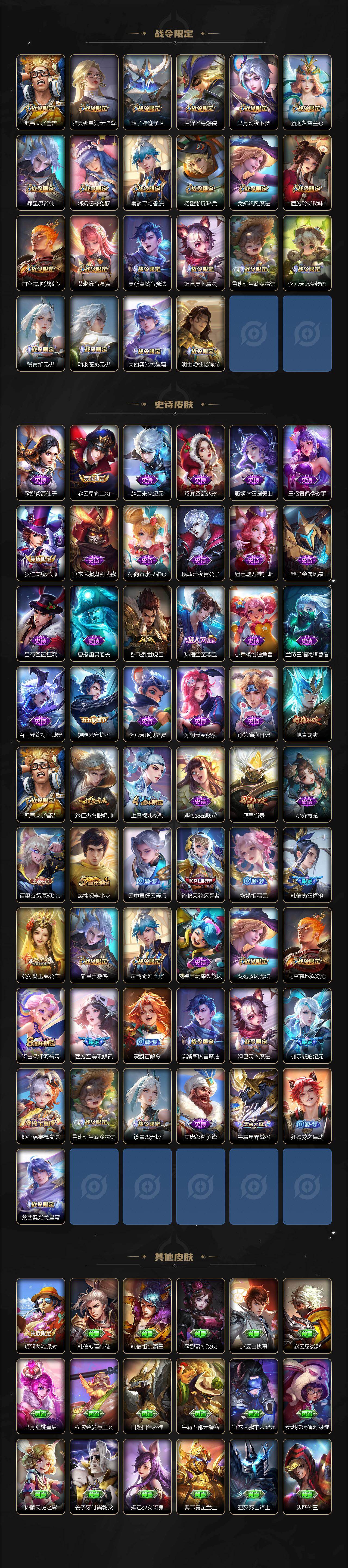 【限定皮肤】:姜子牙天穹之誓,杨戬破阵退雄兵,狄仁杰阴阳师,赵云皇家上将,墨子神迹守卫,孙膑天狼运算者,扁鹊奇幻香踪,芈月幻夜卜梦,甄姬落雪兰心,典韦蓝屏警告,典韦岱宗,狄仁杰魔术师,项羽