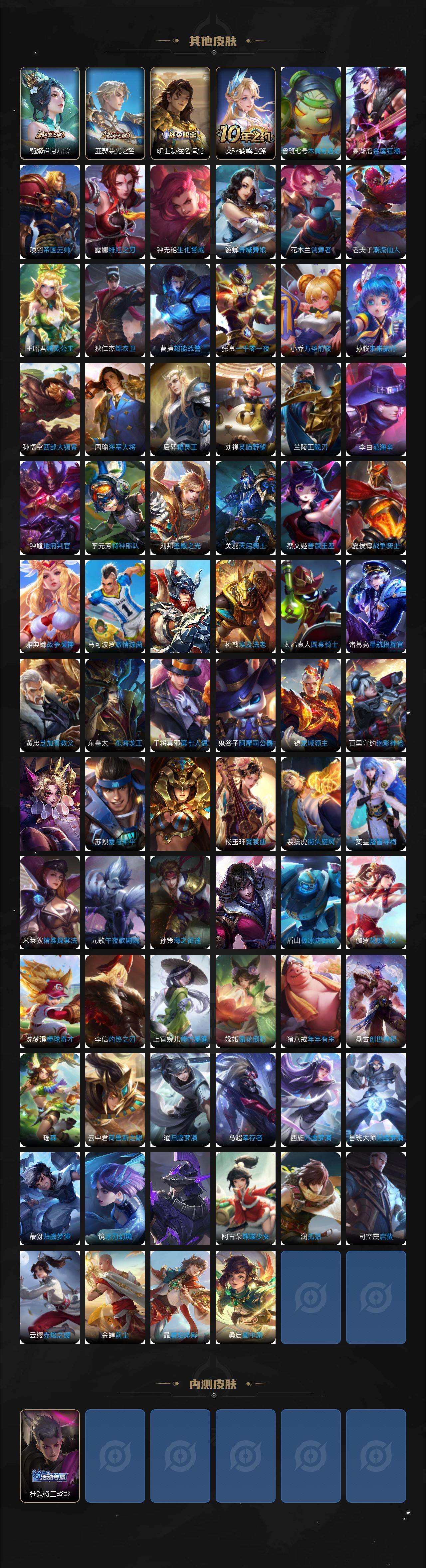 【传说皮肤】:后羿神树通天,桑启鸣野蒿,典韦战鼓燎原,马超琥珀纪元,铠琥珀纪元,澜逐花归海,女娲补天,铠绛天战甲,刘备时之恋人,花木兰冠军飞将,后羿黄金射手座