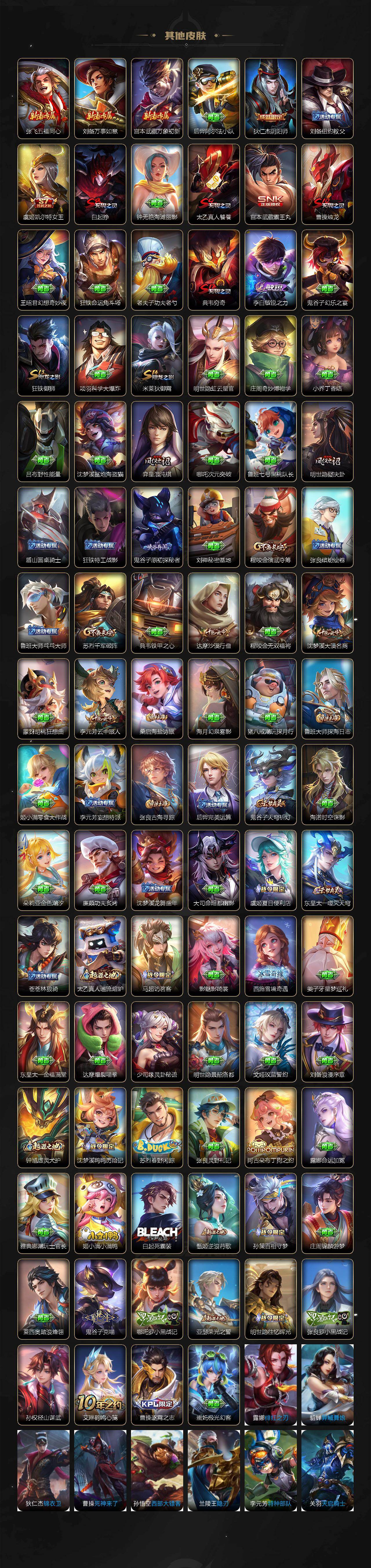 【传说皮肤】:司空震愿照山河定,云缨幻光神枪,裴擒虎祥瑞亨通,赵云乘龙铭钟鼎,马超无双飞将,孙尚香异界灵契,小乔音你心动,铠绛天战甲,镜炽阳神光,孙悟空零号赤焰,李信一念神魔,干将莫邪久胜战神,虞姬云霓雀翎,百里玄策白虎志,梦奇胖达荣荣,宫本武藏地狱之眼