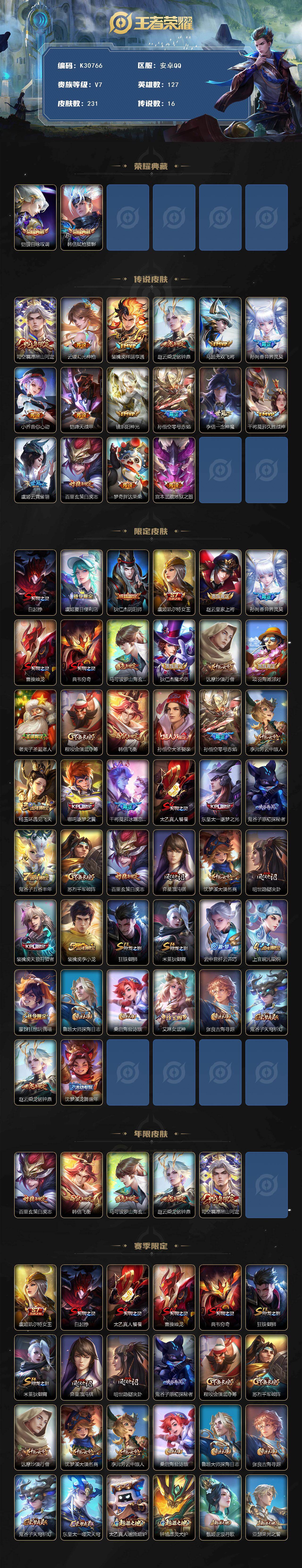 安卓Q-V7-至尊星耀IV段位-127英雄-231皮肤-2典藏皮肤-16传说-65史诗