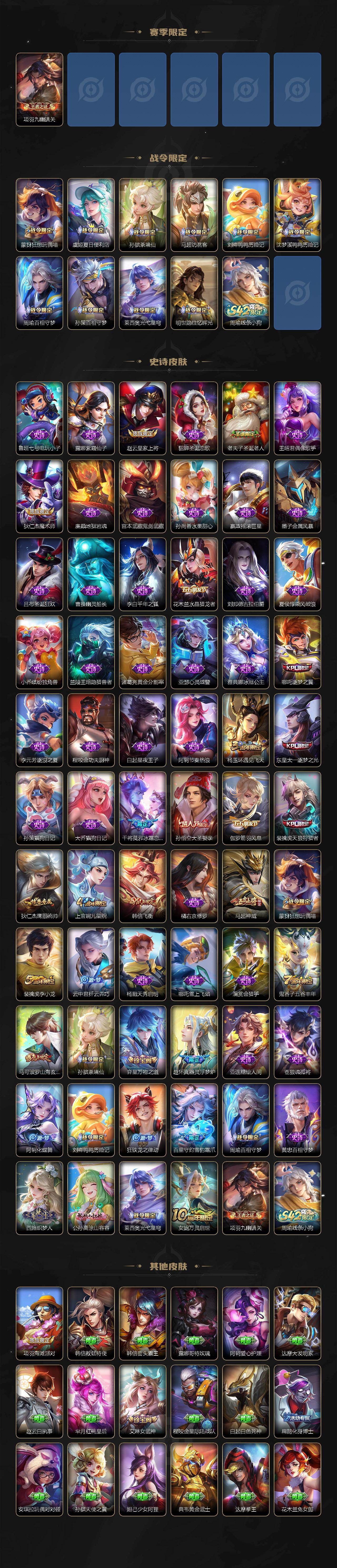 【限定皮肤】:白起狰,虞姬夏日便利店,狄仁杰阴阳师,虞姬凯尔特女王,赵云皇