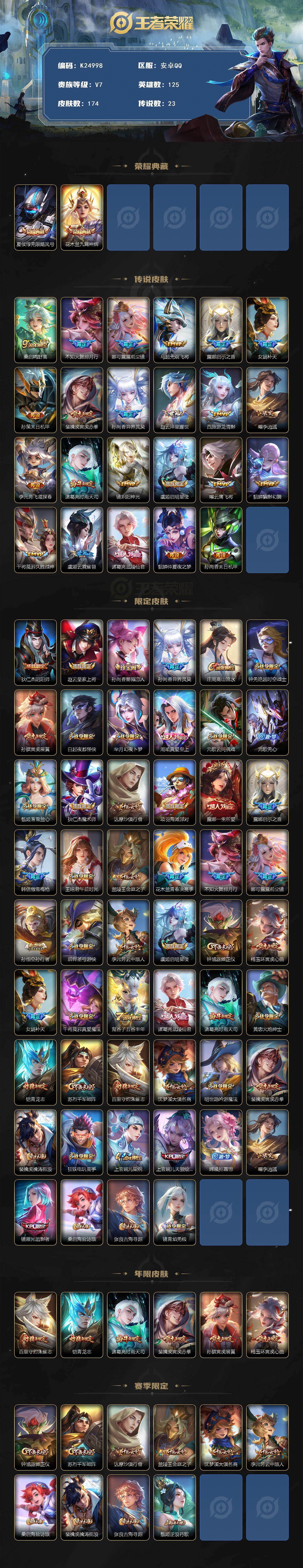 安卓Q-V7-至尊星耀V段位-125英雄-174皮肤-2典藏皮肤-23传说-63史诗