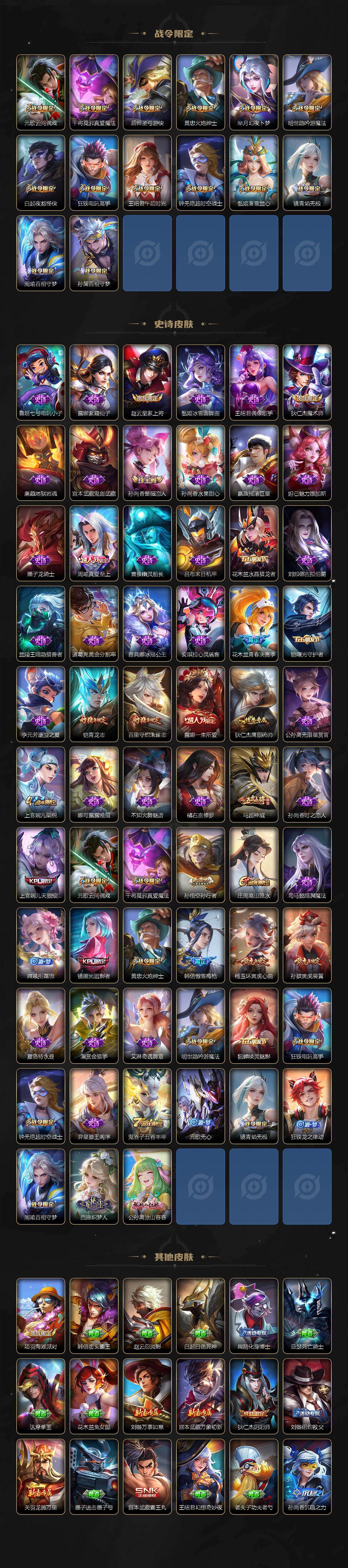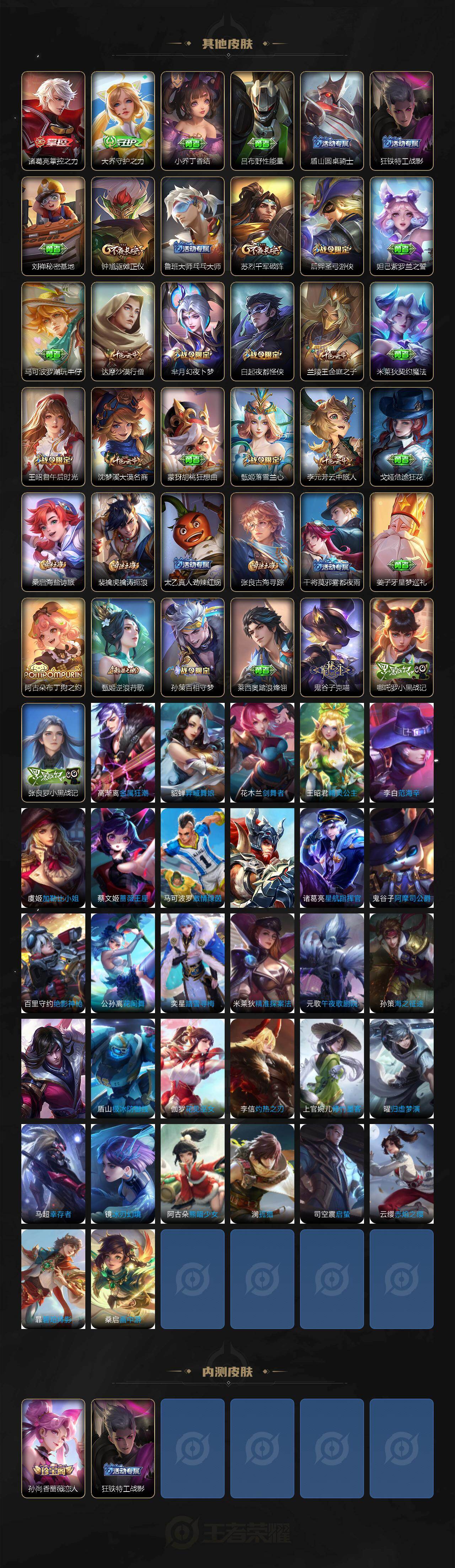 【传说皮肤】:桑启鸣野蒿,不知火舞绯月行,娜可露露前尘镜,马超无双飞将,露娜启示之音,女娲补天,孙策末日机甲,裴擒虎寅虎赤拳,孙尚香异界灵契,赵云淬星耀世,西施游龙清影,曜李逍遥 ,李元芳飞鸢探春,诸葛亮时雨天司,镜炽阳神光,虞姬启明星使,曜云鹰飞将,貂蝉猫影幻舞,干将莫邪久胜战神,虞姬云霓雀翎,诸葛亮武陵仙君,貂蝉仲夏夜之梦,孙尚香末