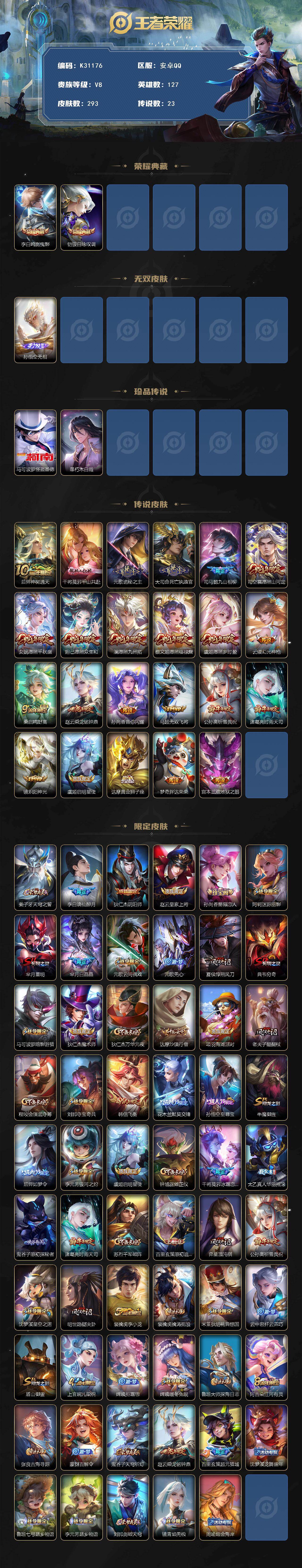 安卓Q-V8-最强王者段位-127英雄-293皮肤-2典藏皮肤-1无双-2珍品传说-23传说-86史诗