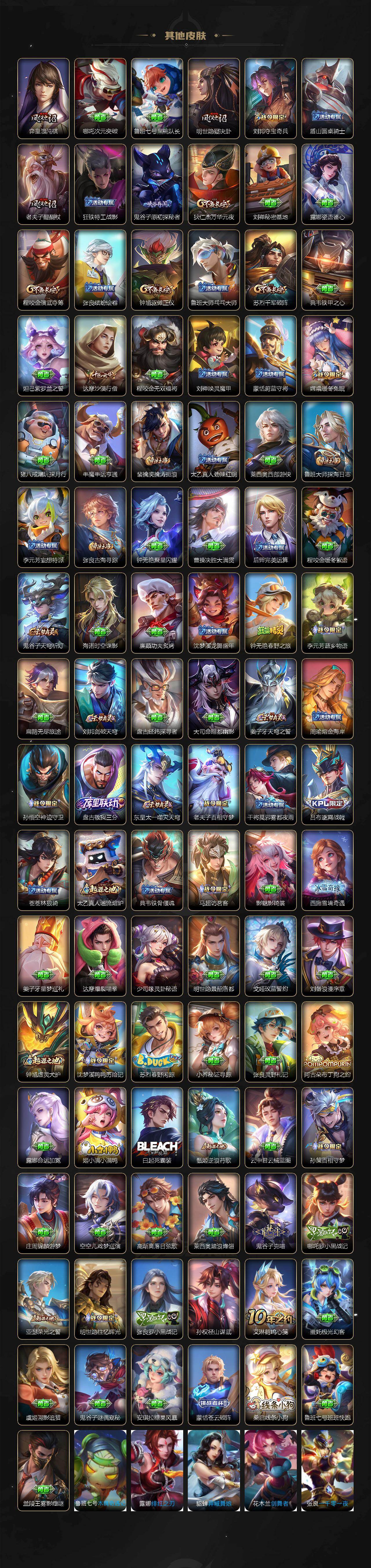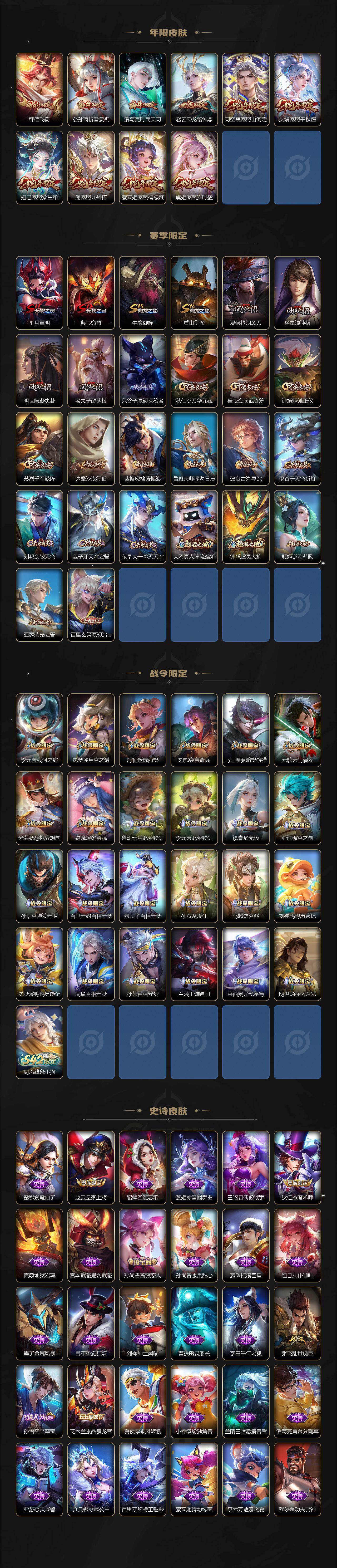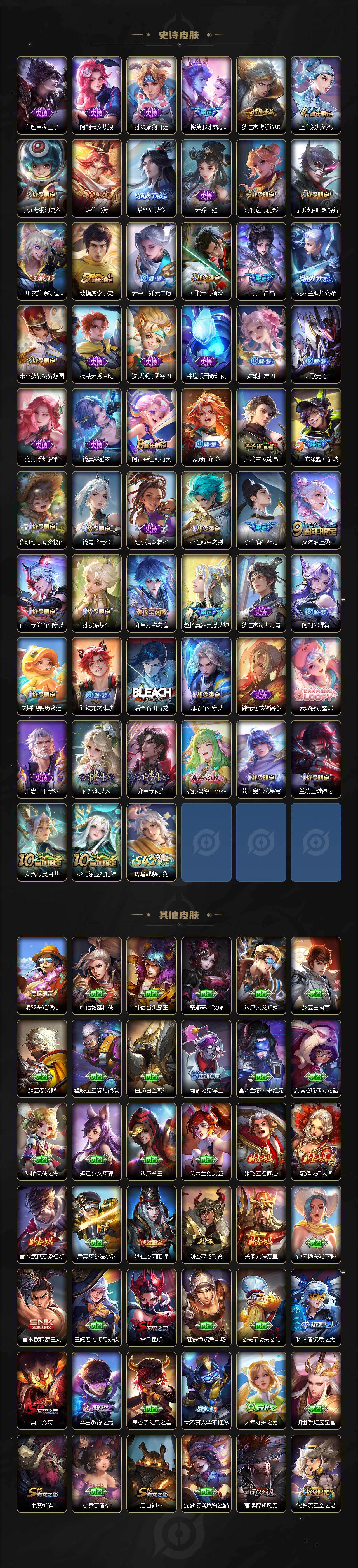 【传说皮肤】:后羿神树通天,干将莫邪千山共赴,元歌诡秘之主,大司命死亡执政官,司马懿九山相柳,司空震愿照山河定,女娲愿照千秋盛,妲己愿照众生和,澜愿照九州拓,蔡文姬愿照福禄聚,虞姬愿照岁时盈,云缨幻光神枪,桑启鸣野蒿,赵云乘龙铭钟