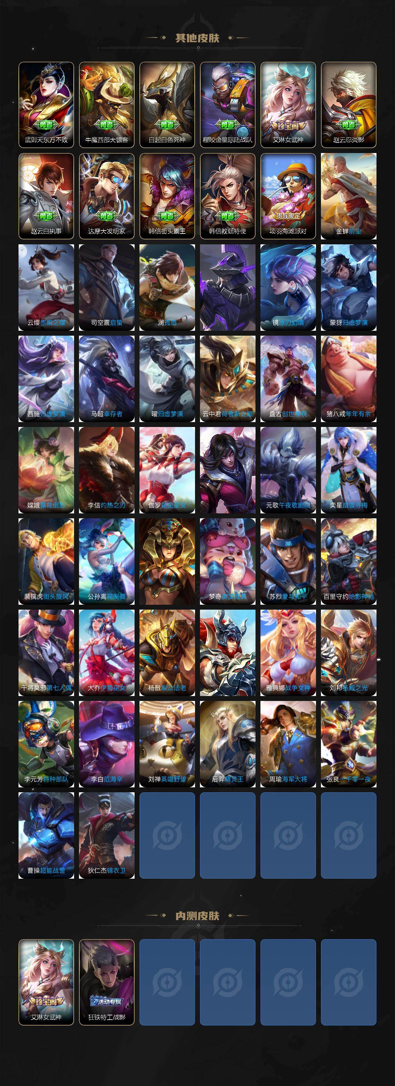 【传说皮肤】:马超神骥逐星野,司空震愿照山河定,云缨幻光神枪,桑启鸣野蒿,曜山海苍雷引,马超无双飞将,曜李逍遥 ,铠绛天战甲,镜炽阳神光,曜云鹰飞将,李信一念神魔,干将莫邪久胜战神,达摩黄金狮子座,花木兰冠军飞将,后羿黄金射手座,孙尚香末日机甲,宫本武藏地狱之眼