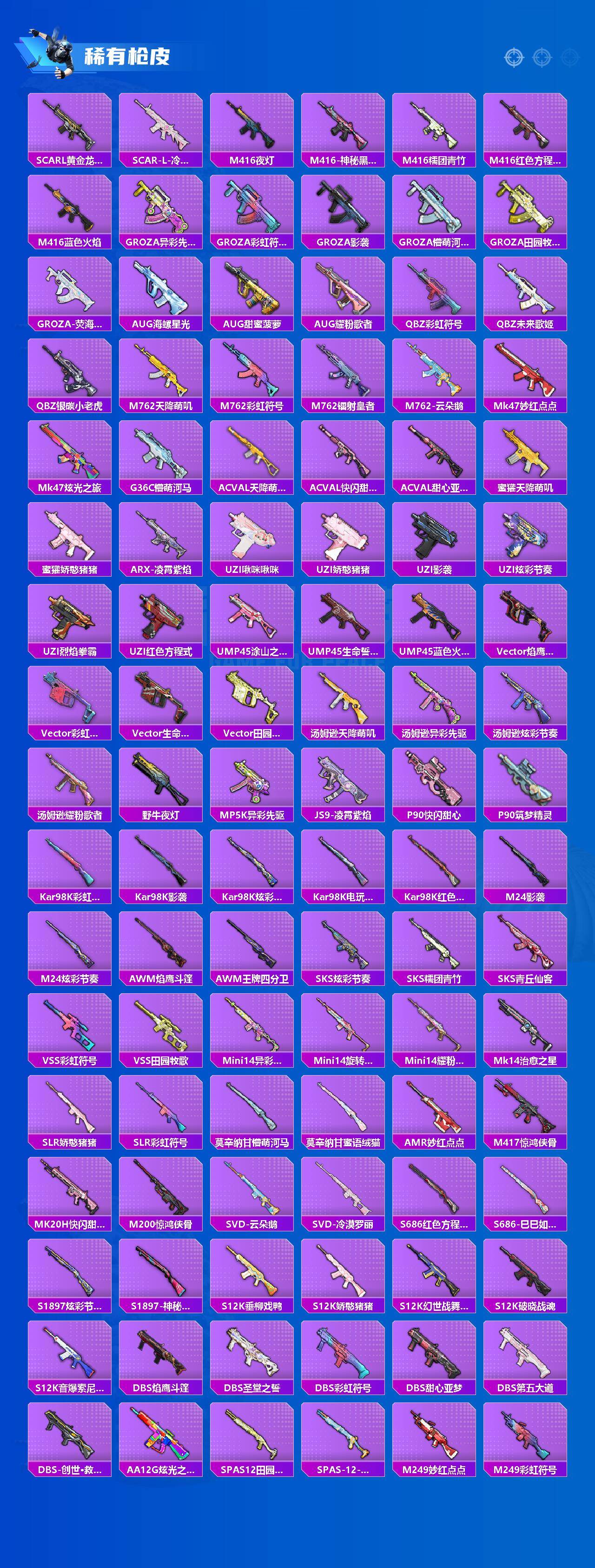 【粉色枪皮等级】:AKM-绿萝繁花(五级),SCAR-L-锦绣绵绵(五级),M416-心之恋语(七级),M762-青锋波束(五级),UMP45-量子极限(五级),Kar98K-巳巳如意(