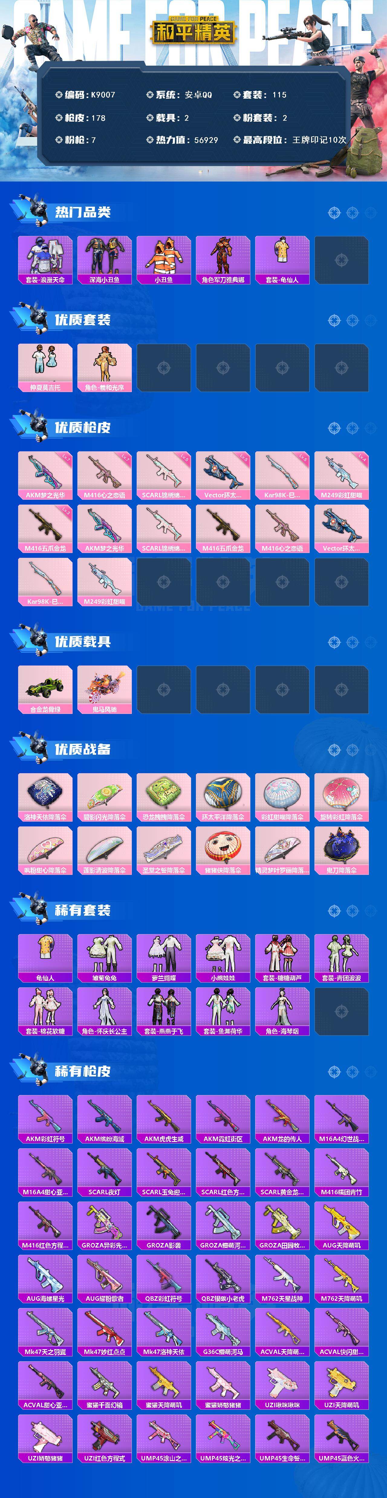 安卓 手Q-2粉装-7特效枪-2载具-0粉色飞行器-56929热力值-10王牌印记-115套装-178枪皮
