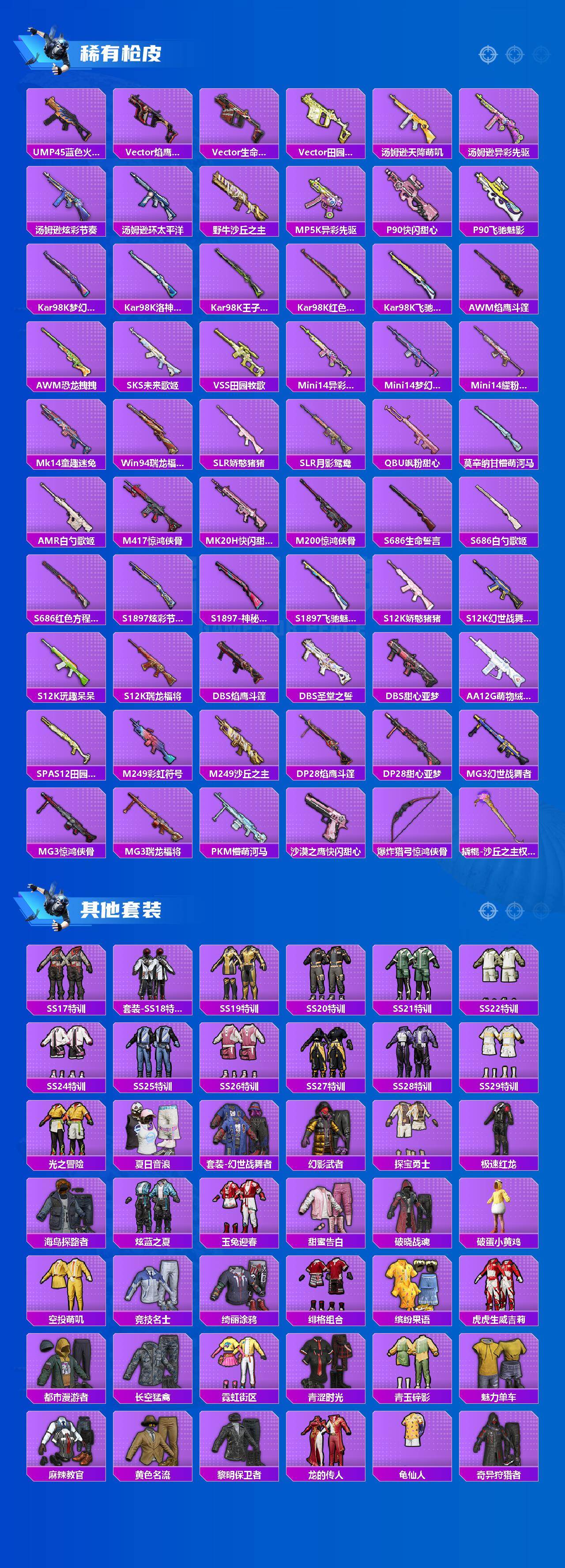 【粉色枪皮等级】:AKM-梦之光华(七级),SCAR-L-锦绣绵绵(五级),M416-五爪金龙(三级),M416-心之恋语(七级),Vector-环太平洋(五级),Kar98K-巳巳如意(五级),M249-彩虹甜喵(四级)