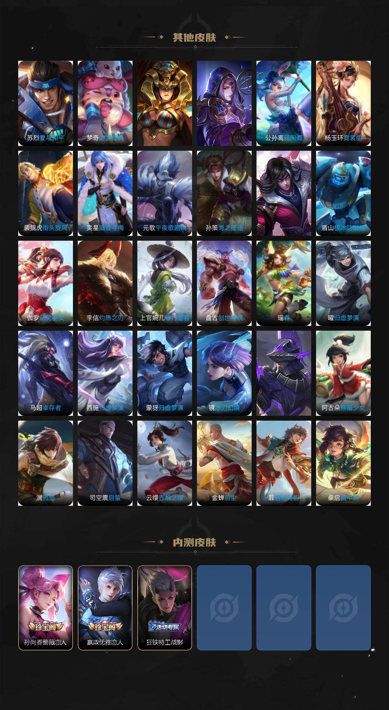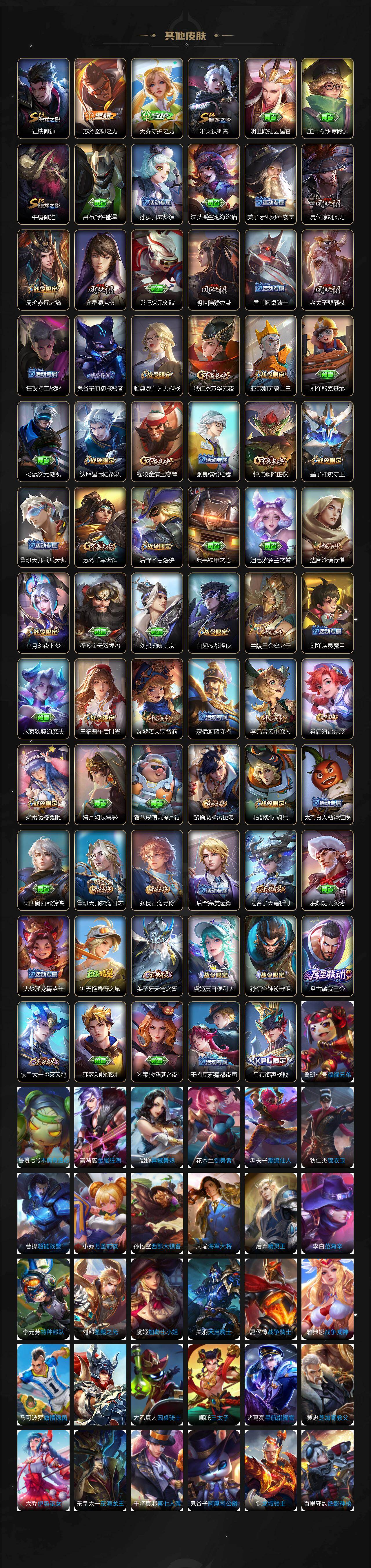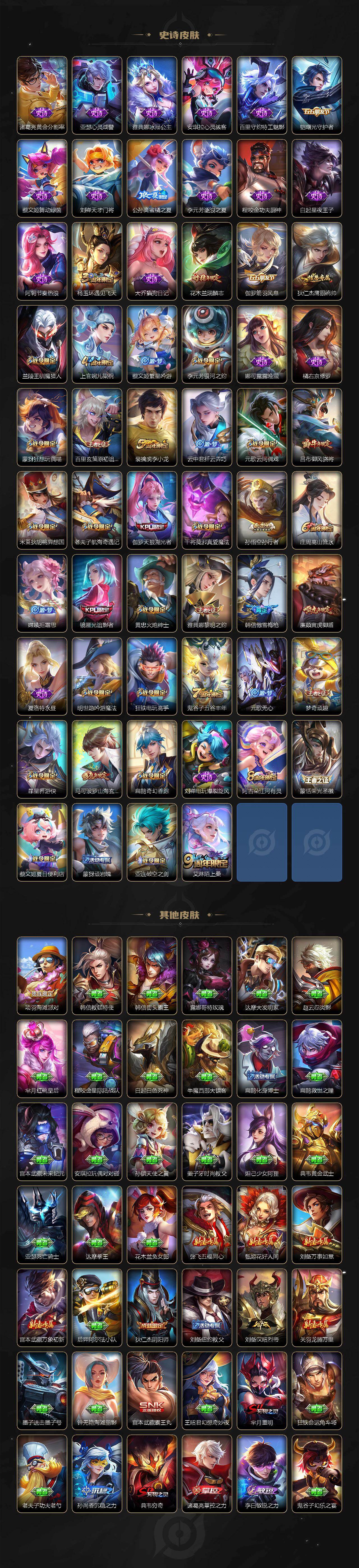 【传说皮肤】:桑启鸣野蒿,公孙离记忆之芯,孙悟空齐天大圣,赵云淬星耀世,王昭君乞巧织情,铠绛天战甲,镜炽阳神光,虞姬启明星使,李信一念神魔,刘备时之恋人,干将莫邪久胜战神,梦奇胖达荣荣,后羿黄金射手座,孙尚香末日机甲,宫本武藏地狱之眼,狄仁杰超时空战士