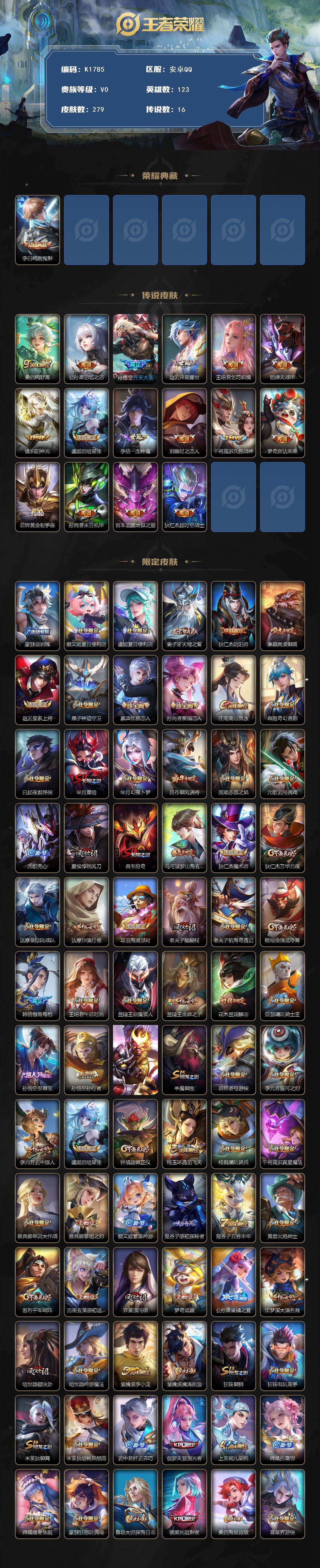 安卓Q-V0-最强王者段位-123英雄-279皮肤-1典藏皮肤-16传说-88史诗