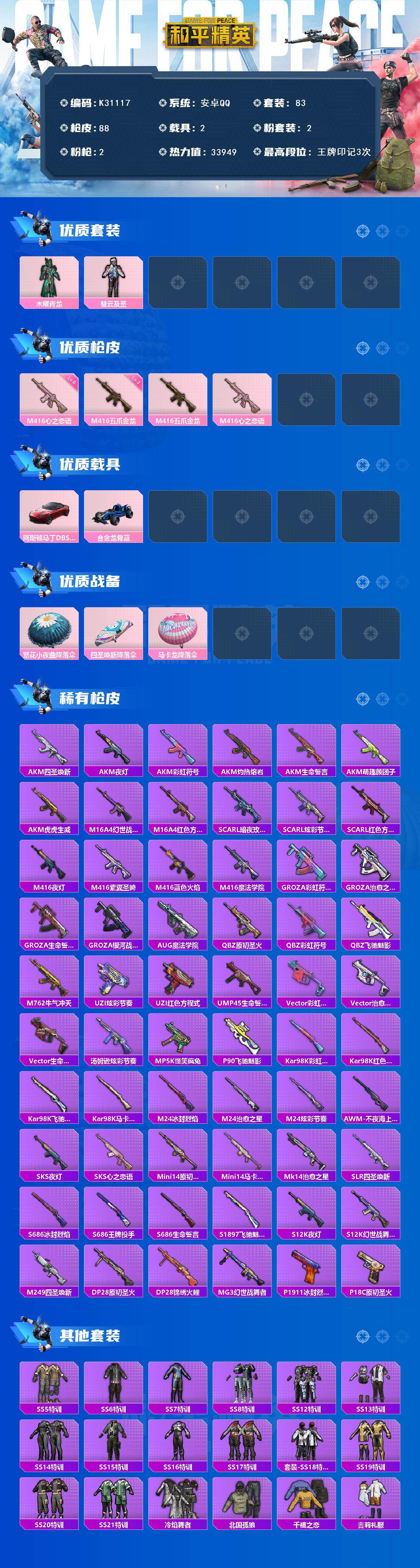 安卓 手Q-2粉装-2特效枪-2载具-0粉色飞行器-33949热力值-3王牌印记-83套装-88枪皮