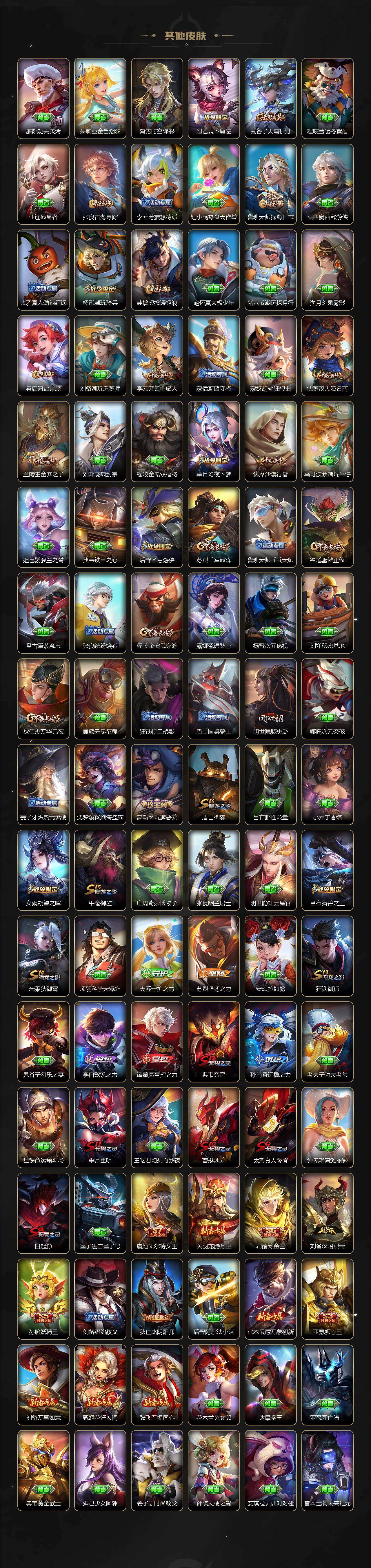 【传说皮肤】:韩信踏浪归,云缨神骥越千峰,司空震愿照山河定,桑启鸣野蒿,李信山海炽霜斩,赵云淬星耀世,镜炽阳神光,虞姬启明星使,孙悟空零号赤焰,刘备时之恋人,达摩黄金狮子座,梦奇胖达荣荣,后羿黄金射手座,诸葛亮武陵仙君,孙尚香末日机甲,宫本