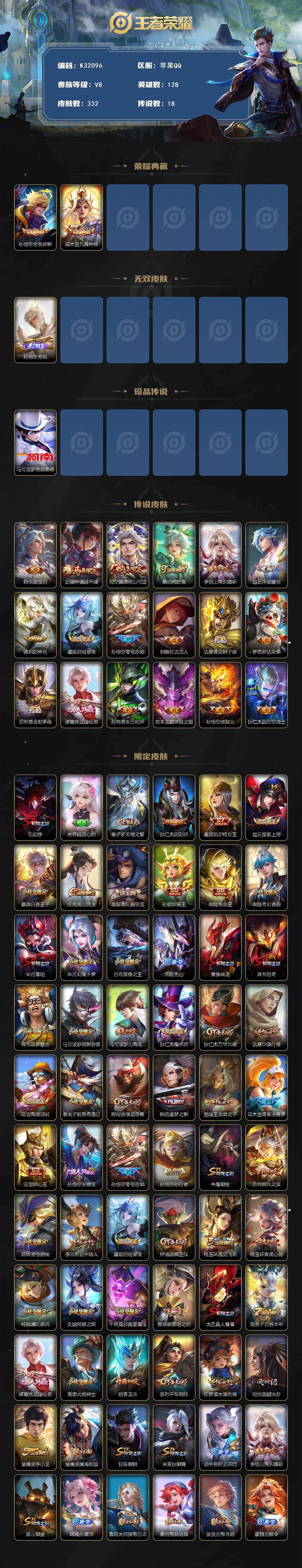 苹果Q-V8-最强王者段位-128英雄-332皮肤-2典藏皮肤-1无双-1珍品传