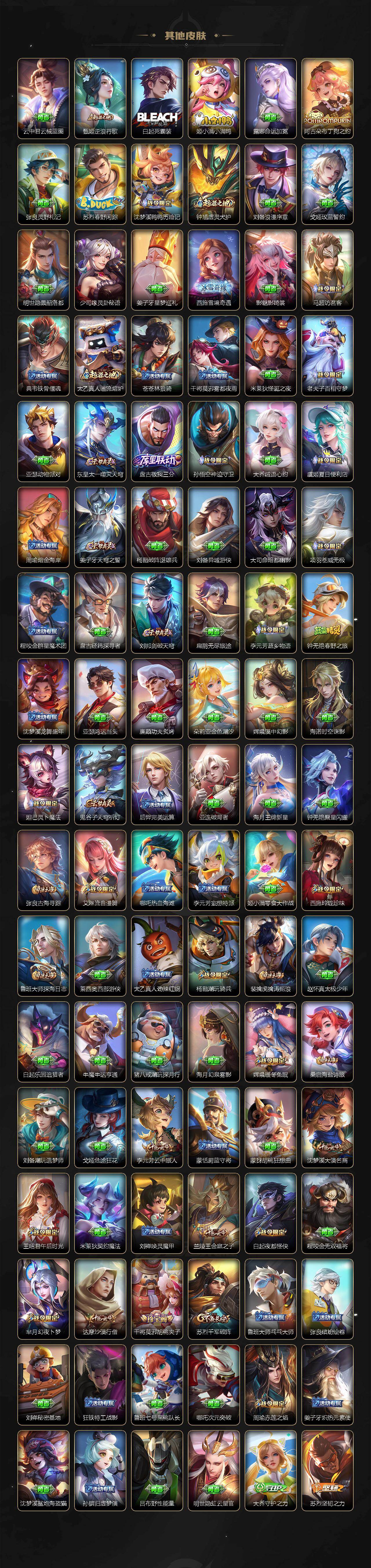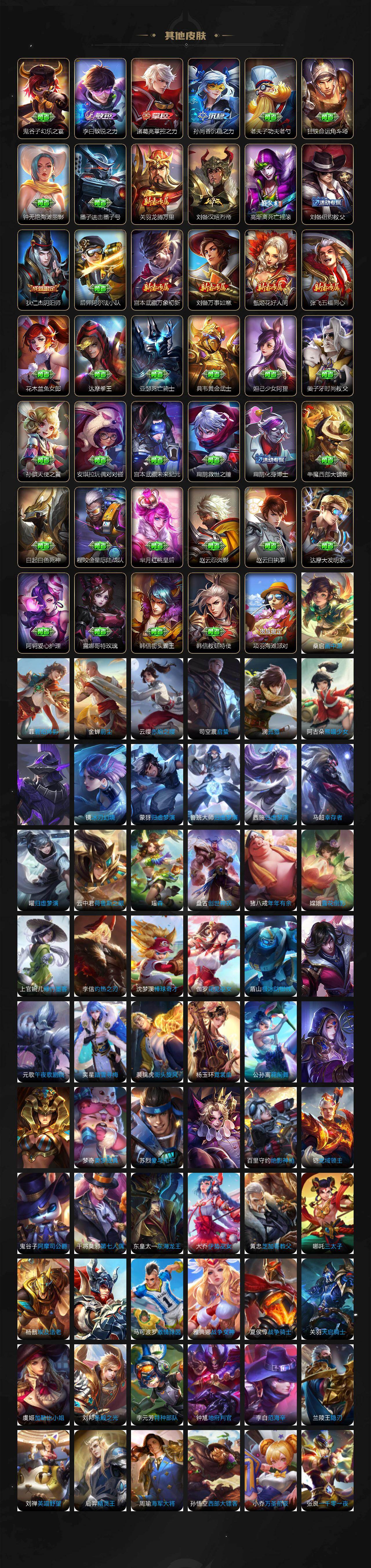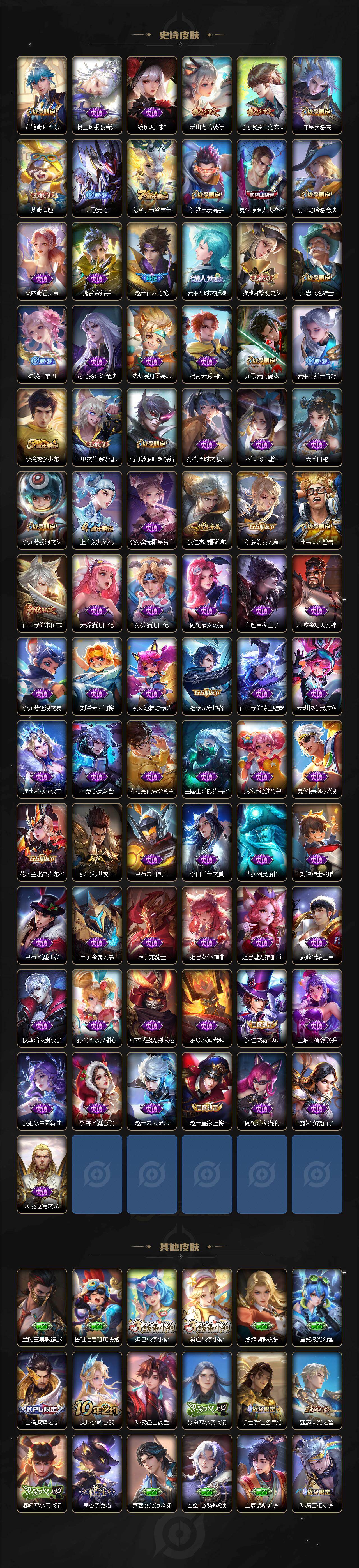 【英雄全皮】:刘禅全皮,元歌全皮,司马懿全皮,孙权全皮,百里守约全皮,云中君全皮,大司命全皮,敖隐全皮,澜全皮,暃全皮,戈娅全皮,空空儿全皮,影全皮,海诺全皮,少司缘全皮