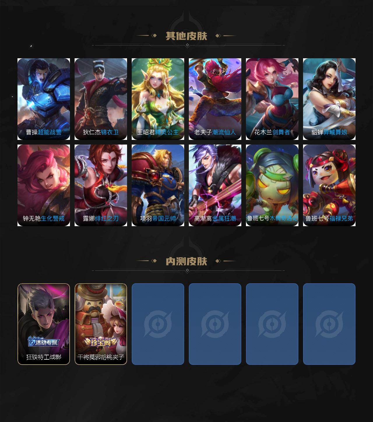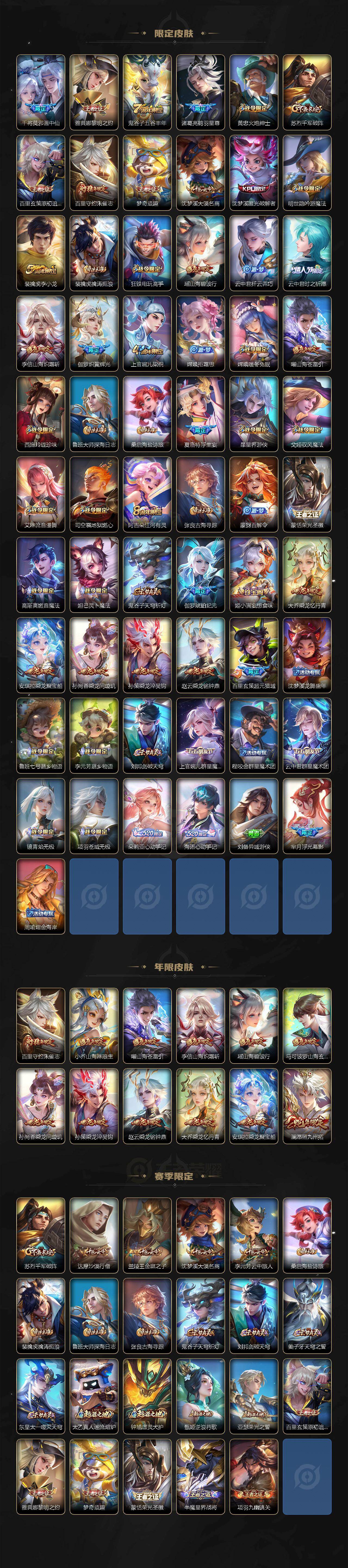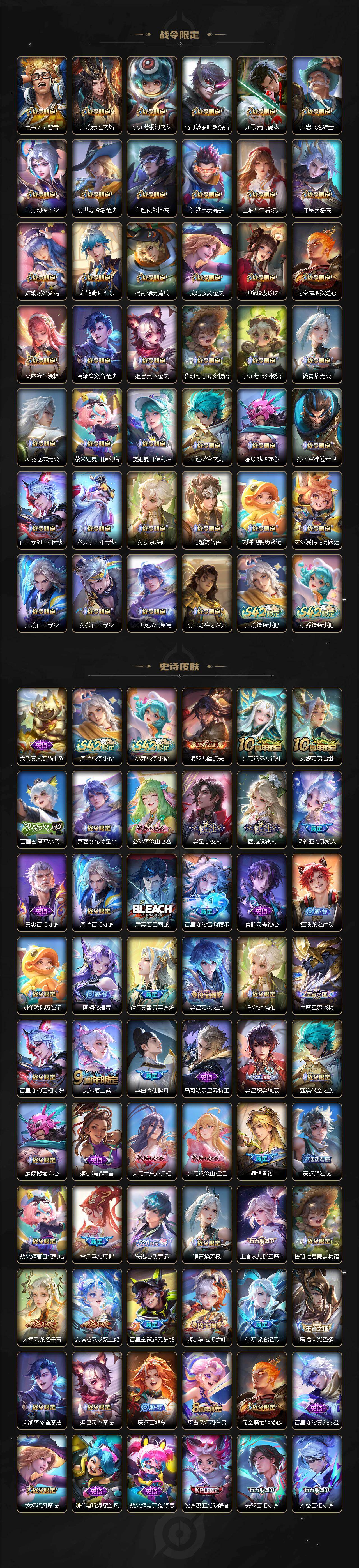 【英雄全皮】:刘禅全皮,元歌全皮,司马懿全皮,孙权全皮,百里守约全皮,云中君全皮,大司命全皮,敖隐全皮,澜全皮,暃全皮,戈娅全皮,空空儿全皮,影全皮,海诺全皮,少司缘全皮