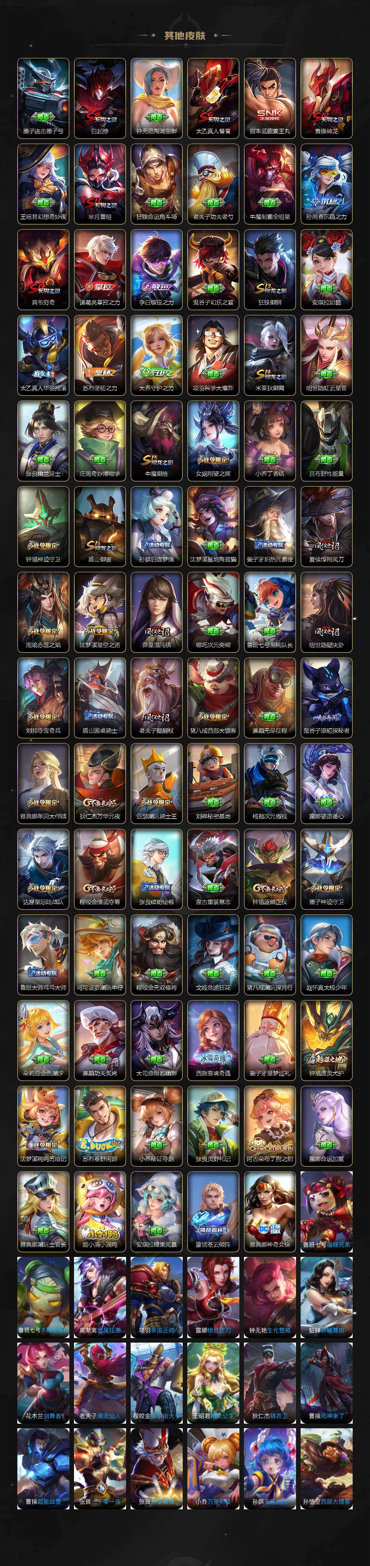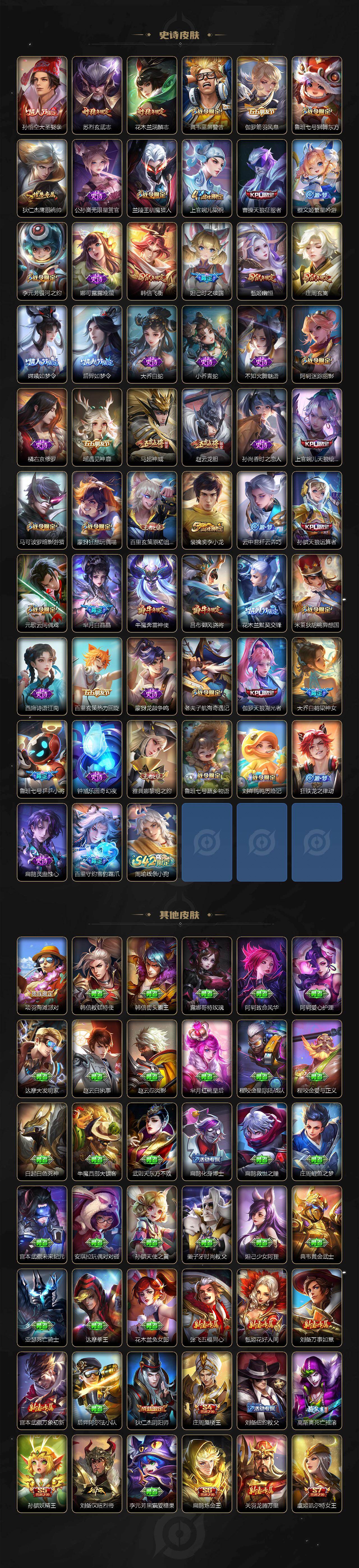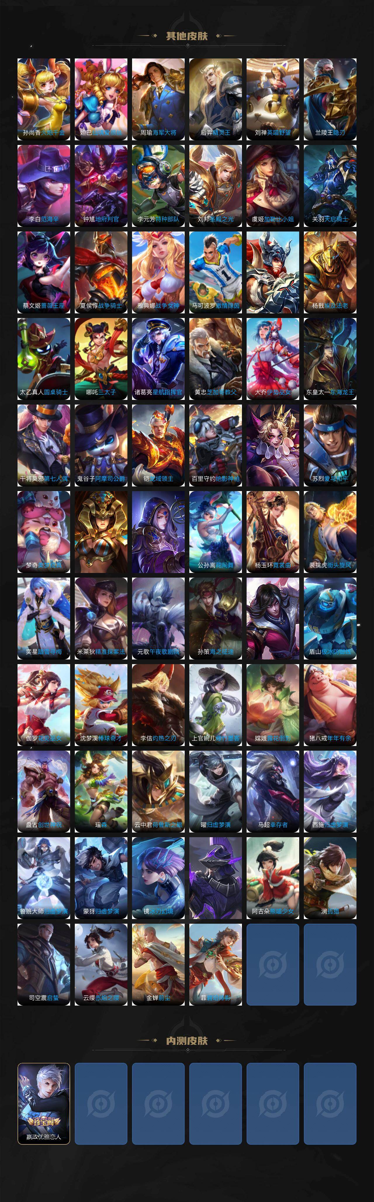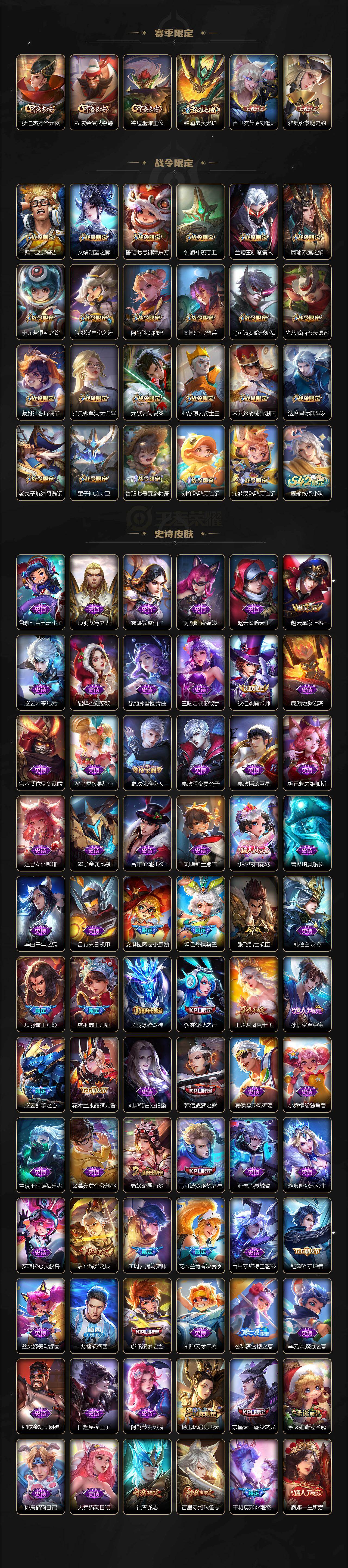 【传说皮肤】:西施续相思,澜愿照九州拓,艾琳觅芳踪,曜李逍遥 ,周瑜音你心动,小乔音你心动,李元芳飞鸢探春,兰陵王默契交锋,公孙离祈雪灵祝,诸葛亮时雨天司,铠绛天战甲,镜炽阳神光,虞姬启明星使,孙悟空零号赤焰,关羽武圣,曜云鹰飞将,李信一念神魔,刘备时之恋