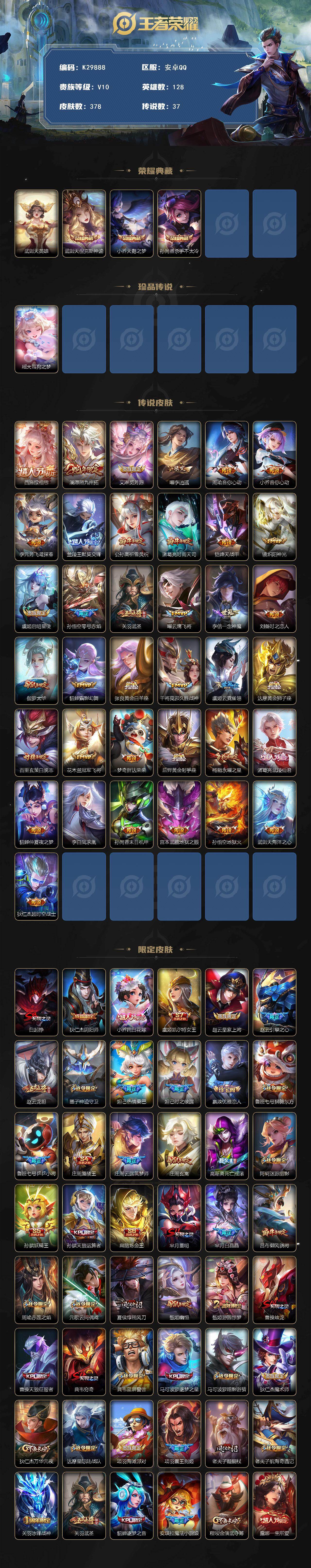 安卓Q-V10-永恒钻石V段位-128英雄-378皮肤-3典藏皮肤-1典藏英雄-1珍品传说-37传说-128史诗