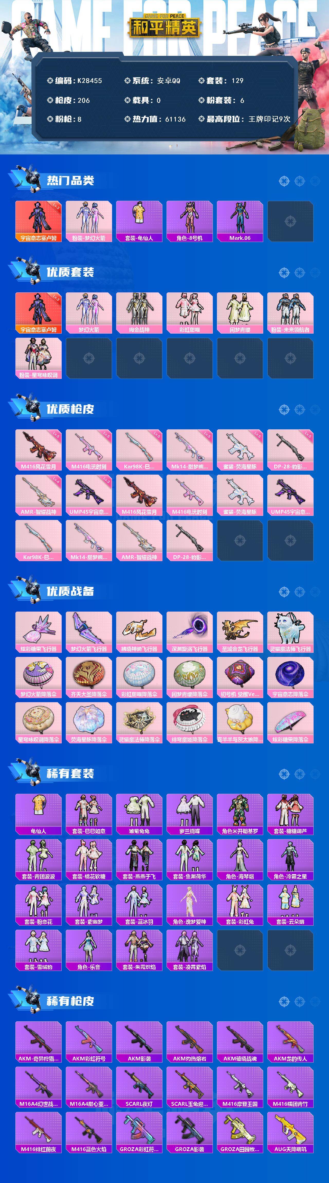 安卓 手Q-1神装-6粉装-8特效枪-0载具-6粉色飞行器-61136热力值-9王牌印记-129套装-206枪皮