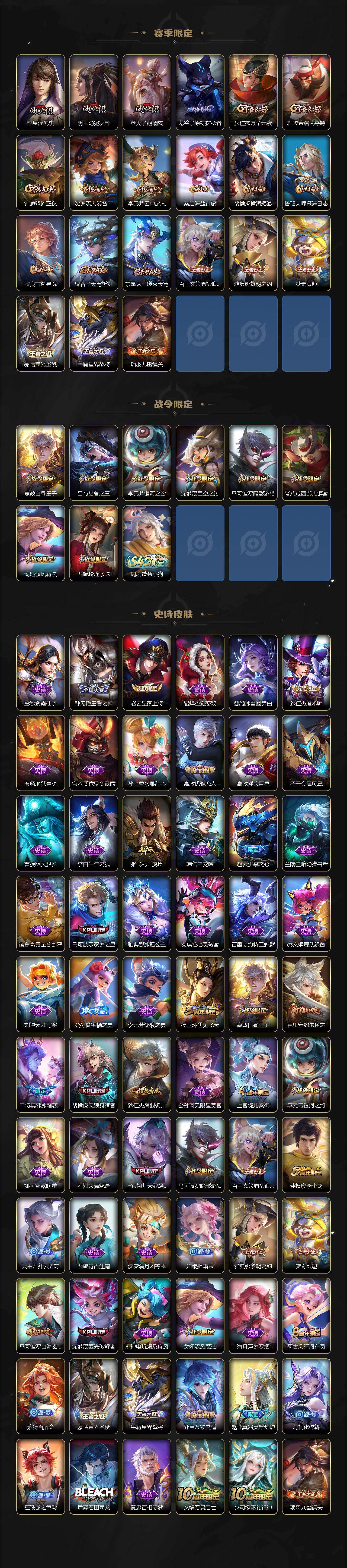 【限定皮肤】:白起狰,狄仁杰阴阳师,虞姬凯尔特女王,赵云皇家上将,赵云引擎之心,嬴政优雅恋人,嬴政白昼王子,钟无艳王者之锤,扁鹊炼金王,芈月重明,吕布猎兽之王,夏侯惇朔风刀,曹