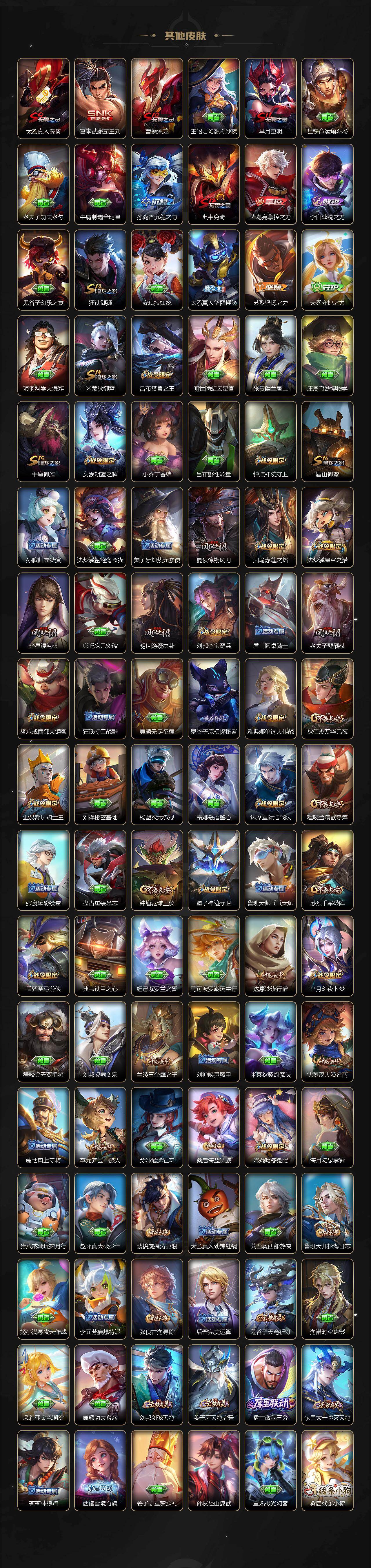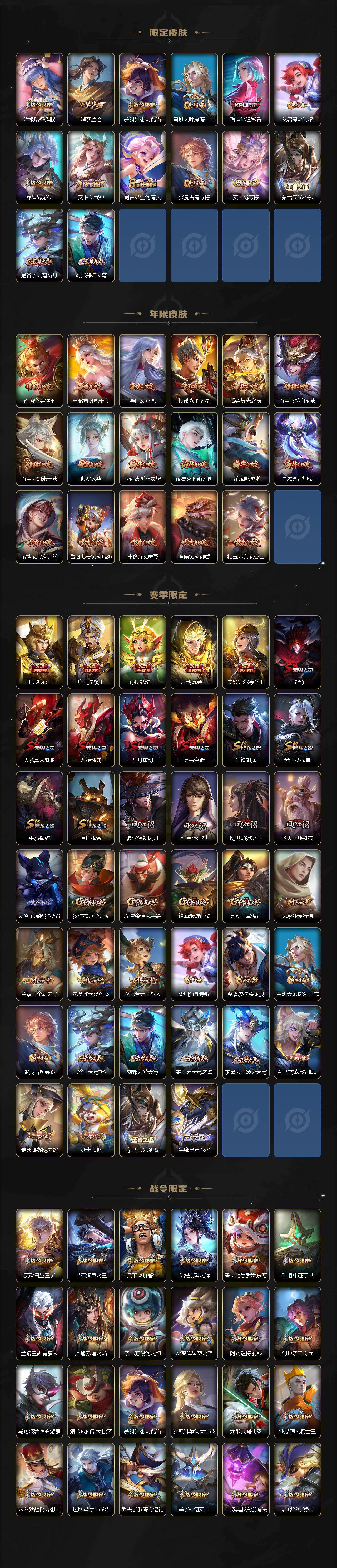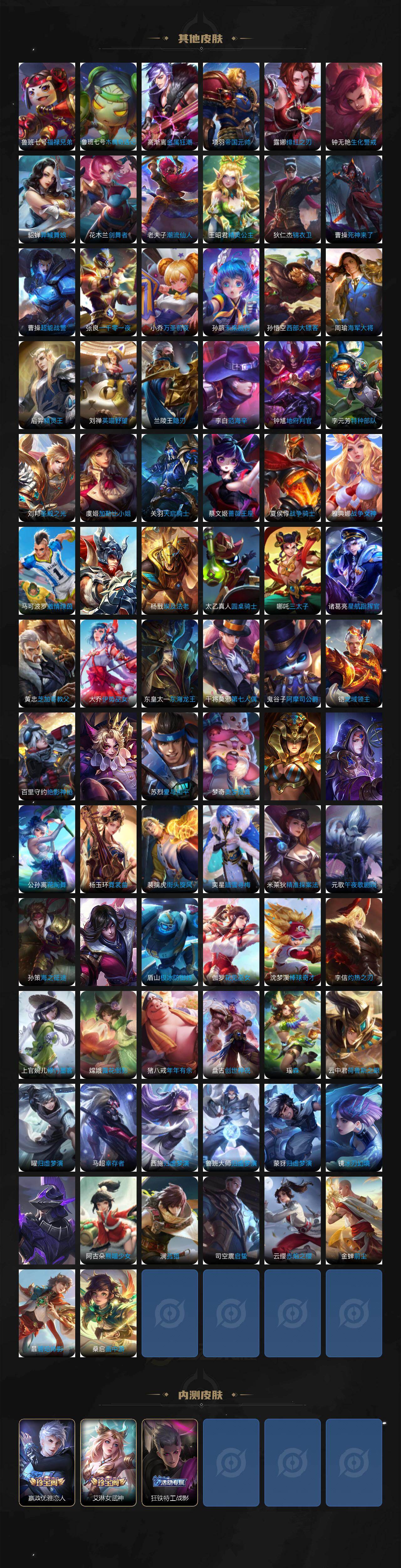 【传说皮肤】:桑启鸣野蒿,艾琳觅芳踪,张飞百相守梦,蔡文姬花朝如约,女娲补天,孙策末日机甲,瑶时之祈愿,裴擒虎寅虎赤拳,鲁班七号寅虎瑞焰,孙尚香异界灵契,貂蝉遇见胡旋,赵云淬星耀