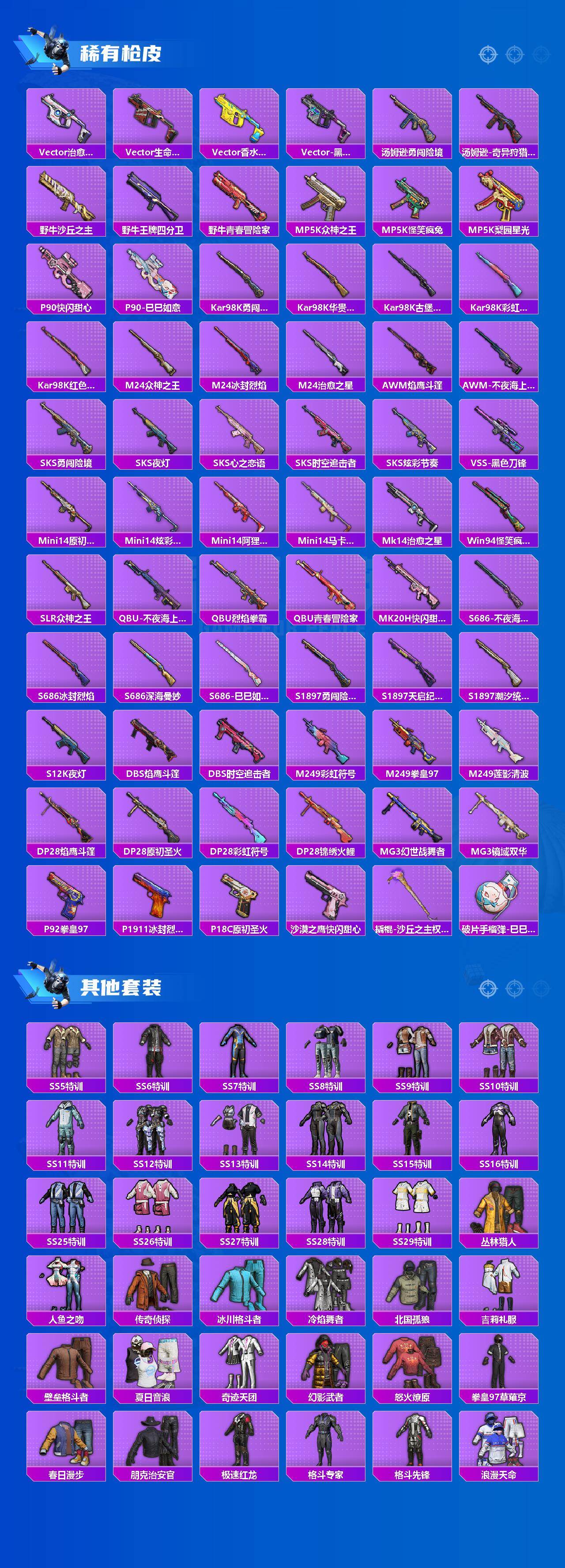 【粉色枪皮等级】:SCAR-L-锦绣绵绵(五级),M416-五爪金龙(七级),汤姆逊-怪笑疯兔(六级),Kar98K-巳巳如意(五级),莫辛纳甘-未来领航者(一级),M249-古战神甲(五级)