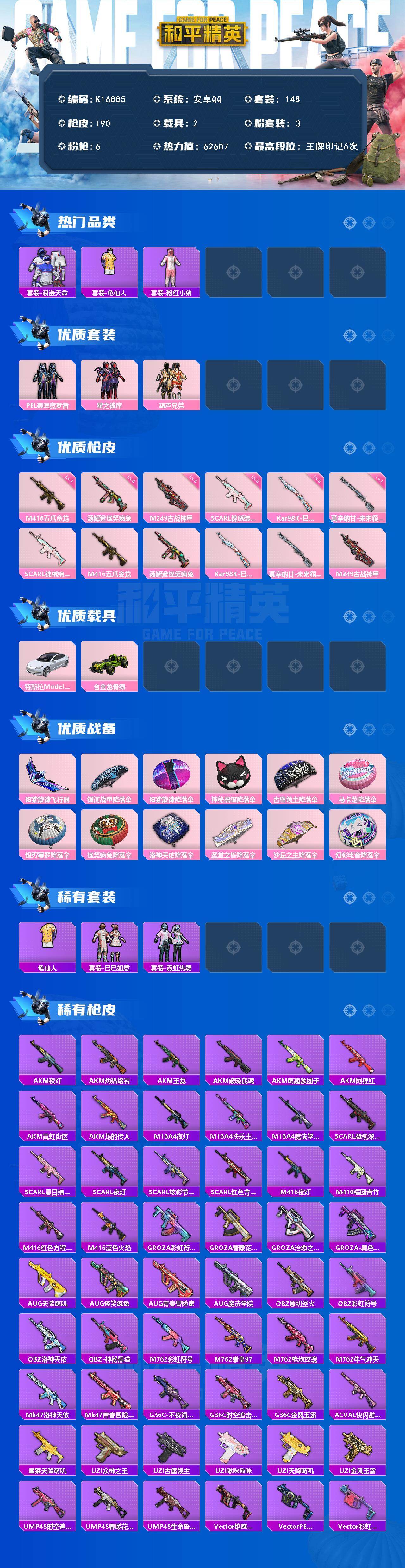 安卓 手Q-3粉装-6特效枪-2载具-1粉色飞行器-62607热力值-6王牌印记-148套装-190枪皮