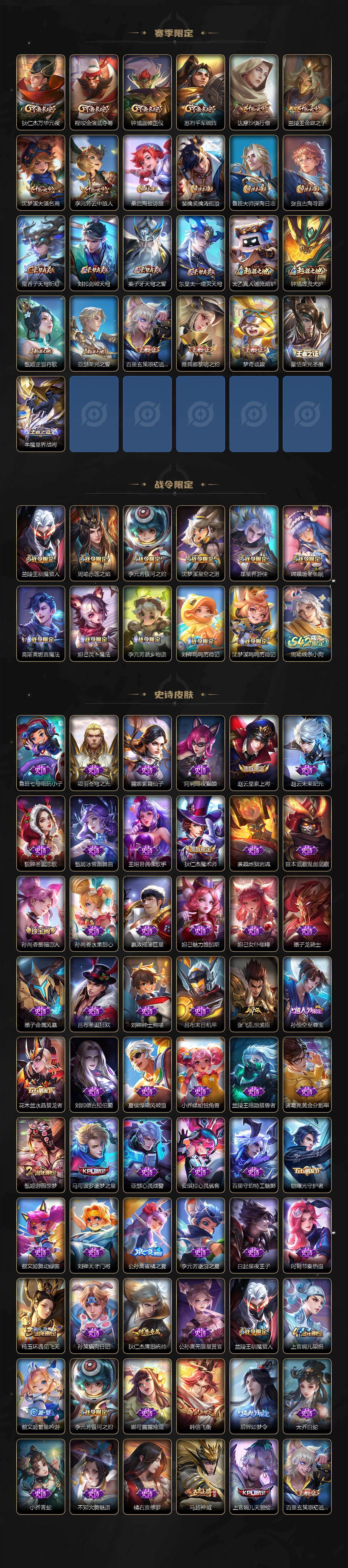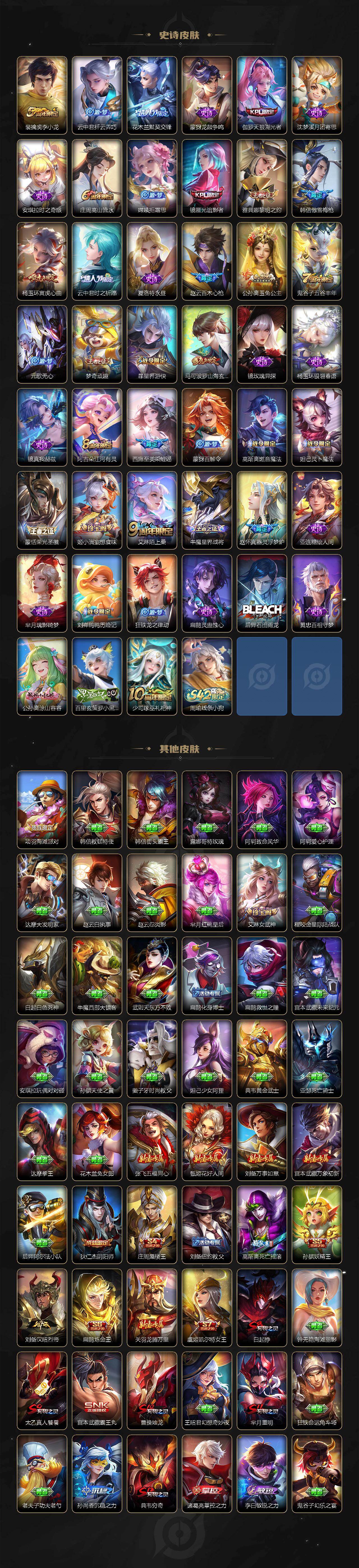 【传说皮肤】:后羿神树通天,公孙离云诺千山,西施续相思,杨玉环星之鸣奏,司空震愿照山河定,女娲愿照千秋盛,妲己愿照众生和,澜愿照九州拓,蔡文姬愿照福禄聚,虞姬愿照岁时盈,云缨幻光神枪,王昭