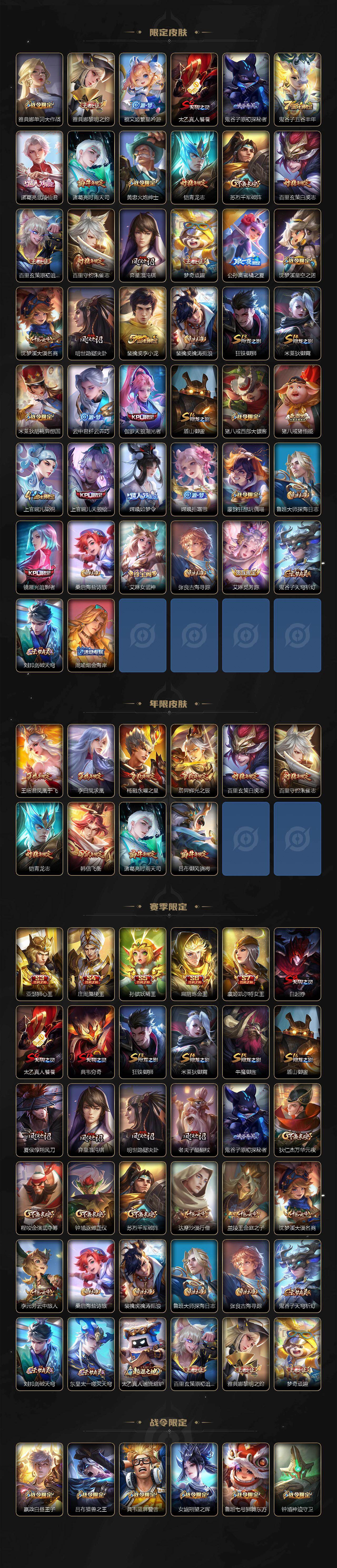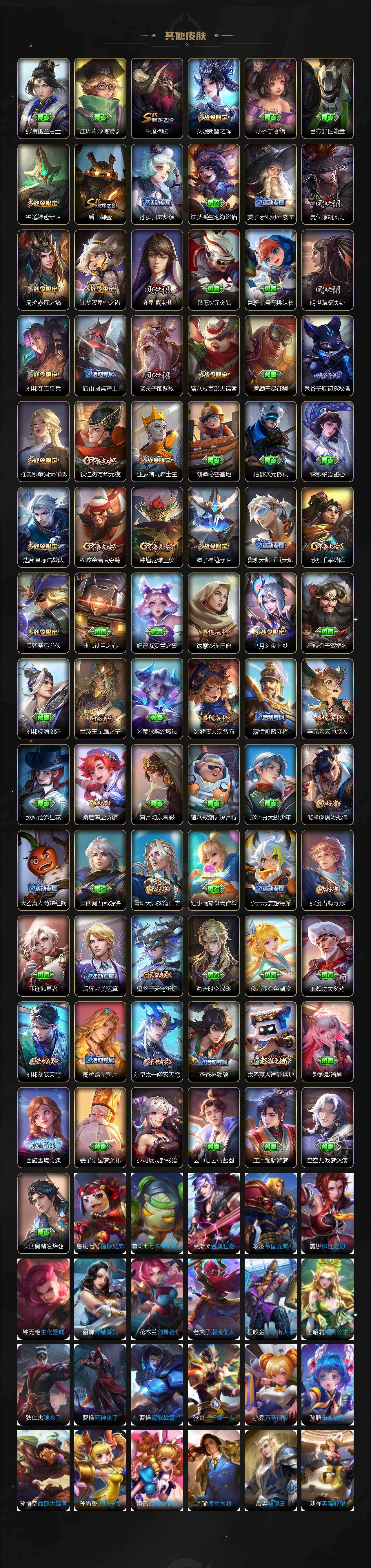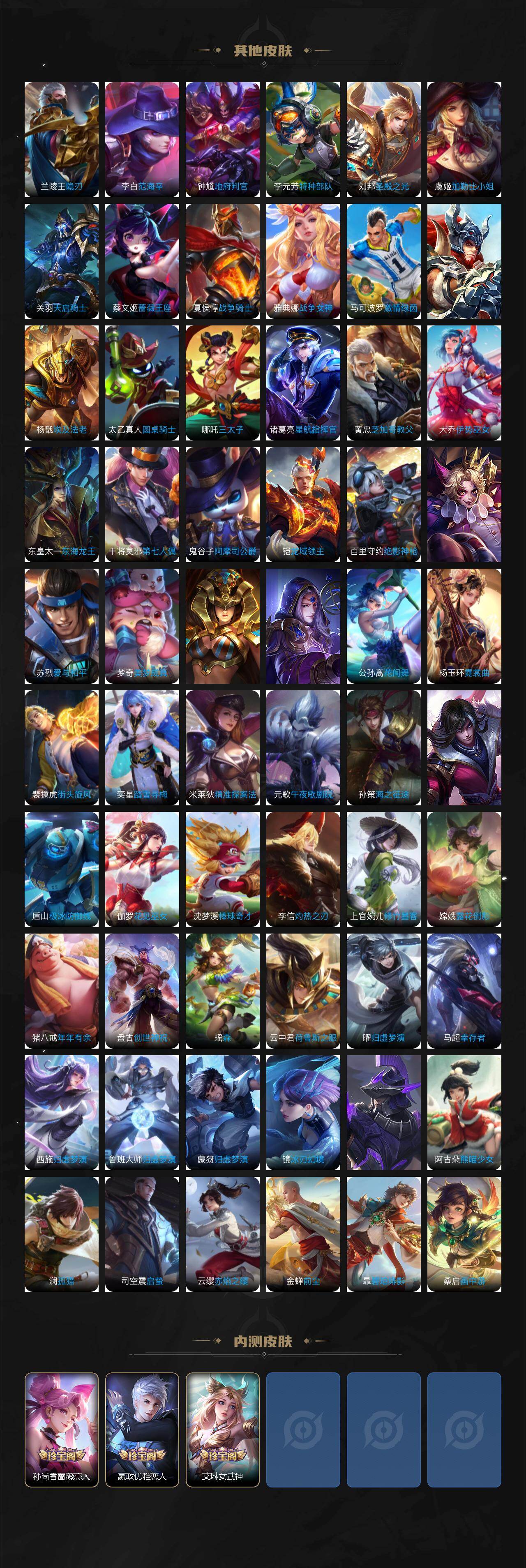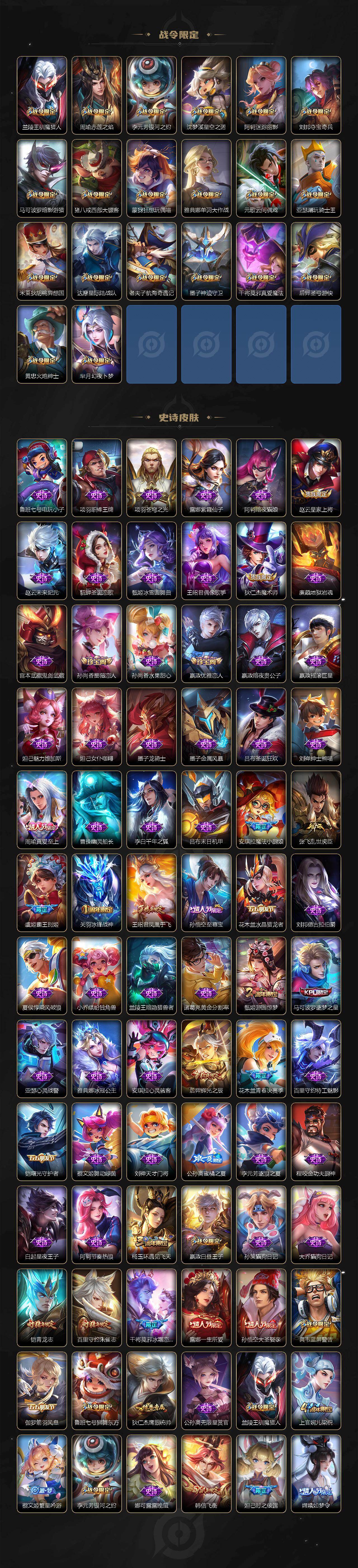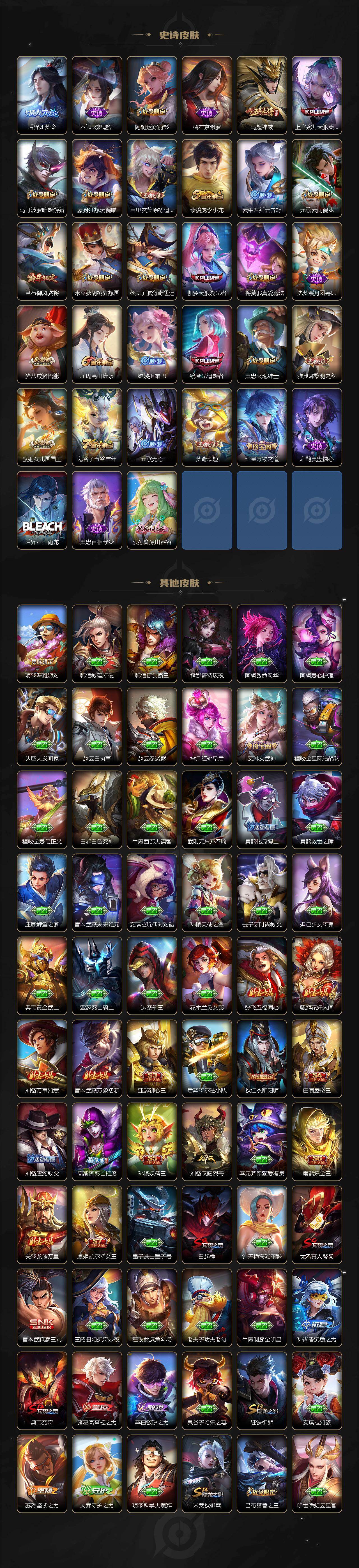 【传说皮肤】:桑启鸣野蒿,艾琳觅芳踪,赵云淬星耀世,王昭君乞巧织情,西施游龙清影,诸葛亮时雨天司,虞姬启明星使,貂蝉猫影幻舞,张良黄金白羊座,干将莫邪久胜战神,百里玄策白虎志,后羿黄金