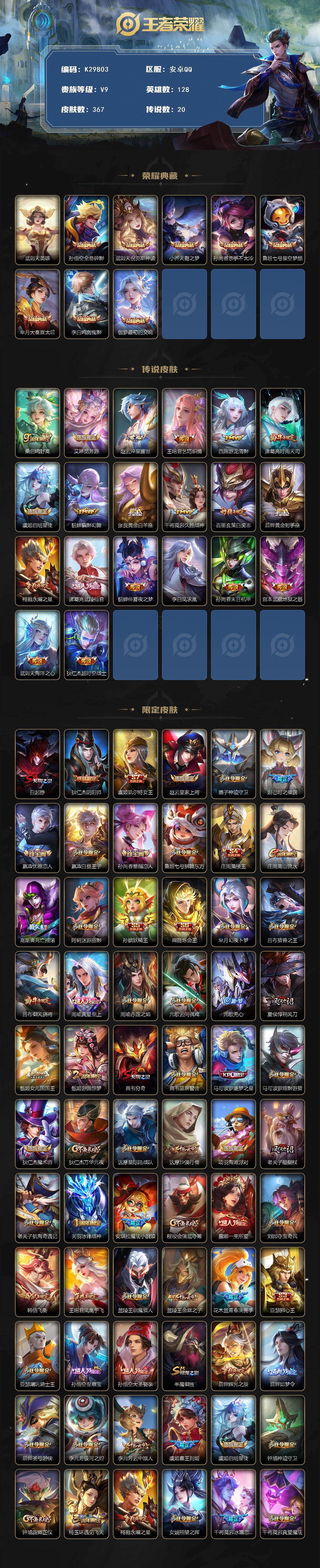 安卓Q-V9-尊贵铂金III段位-128英雄-367皮肤-8典藏皮肤-1典藏英雄-20传说-111史诗