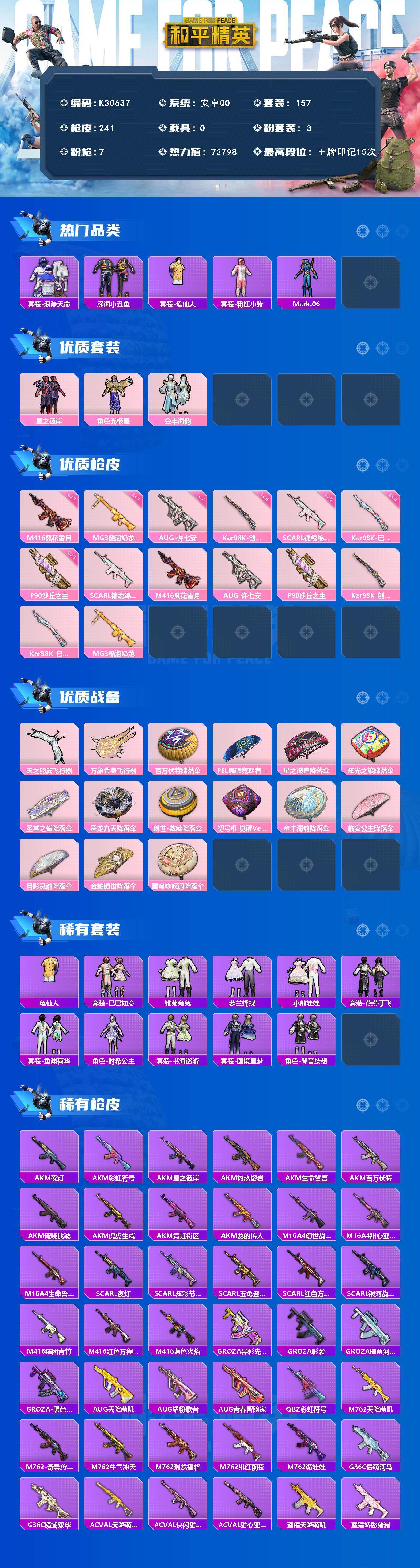 安卓 手Q-3粉装-7特效枪-0载具-2粉色飞行器-73798热力值-15王牌印记-157套装-241枪皮