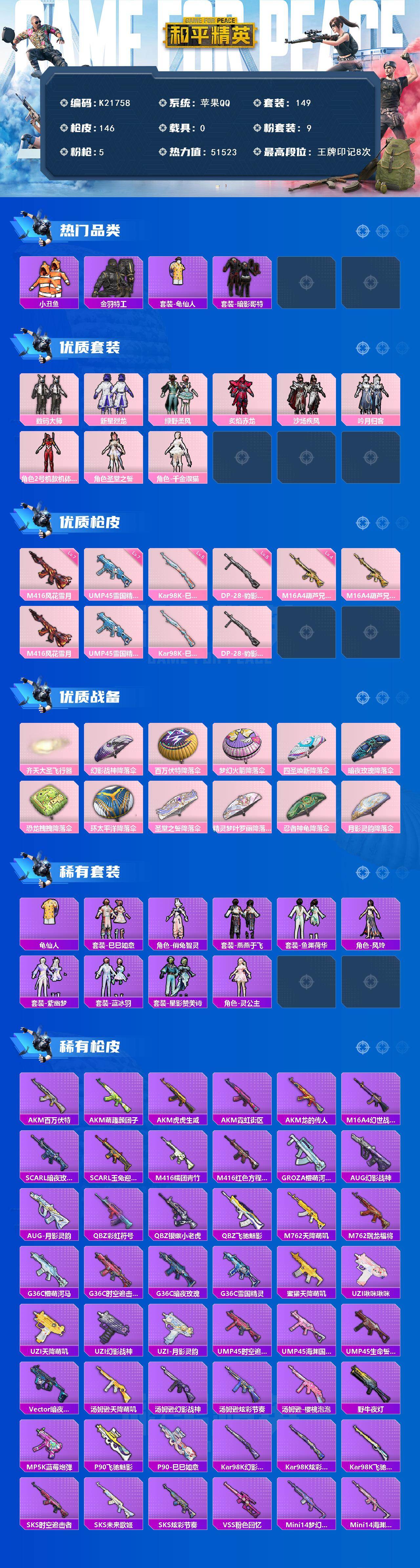 苹果 手Q-9粉装-5特效枪-0载具-1粉色飞行器-51523热力值-8王牌印记-149套装-146枪皮