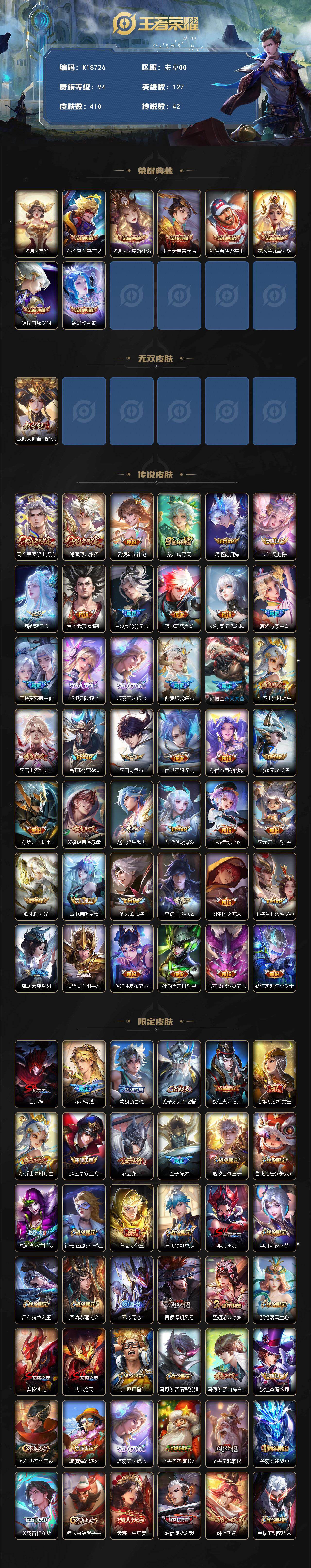 安卓Q-V4-至尊星耀V段位-127英雄-410皮肤-7典藏皮肤-1典藏英雄-1无双-42传说-124史诗