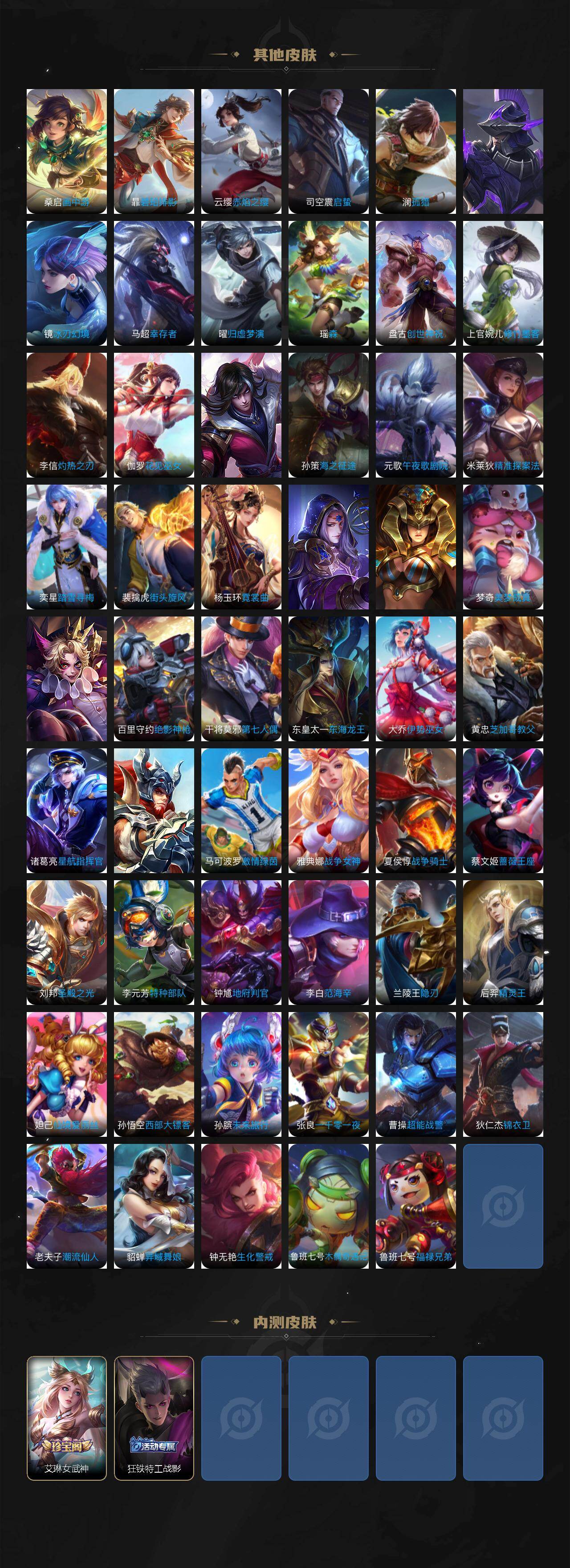 【限定皮肤】:白起狰,大乔绒语心约,姜子牙天穹之誓,狄仁杰阴阳师,虞姬凯尔特女王,赵云皇家上将,庄周蜃楼王,庄周高山流水,高渐离死亡摇滚,阿轲迷踪丽影,孙膑妖精王,扁鹊炼金王,