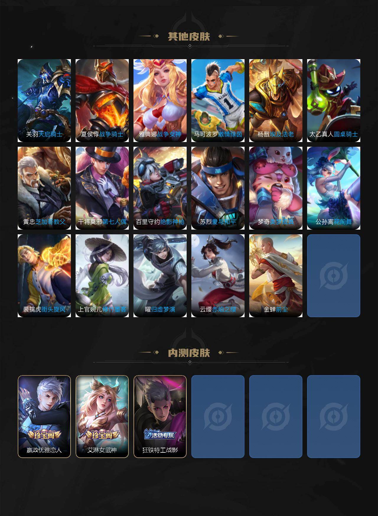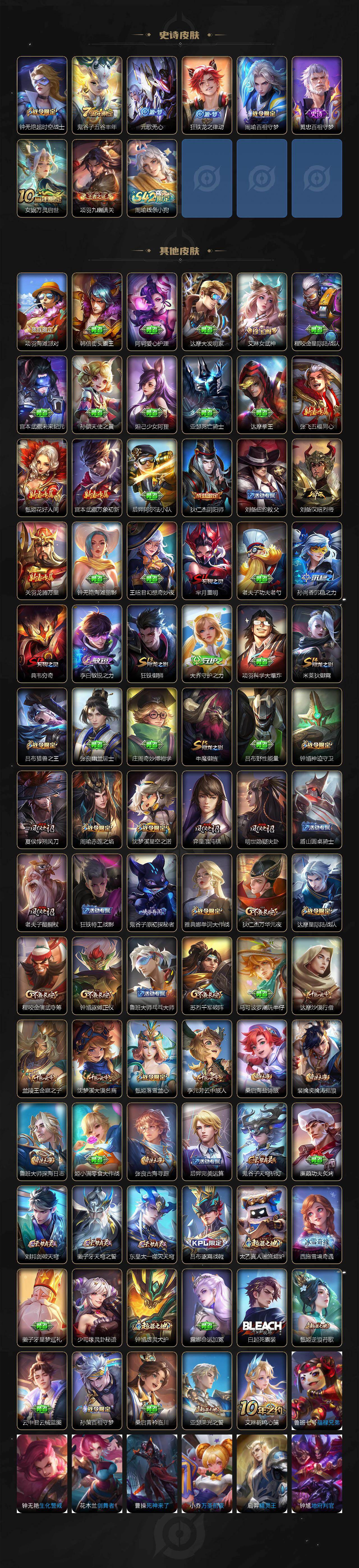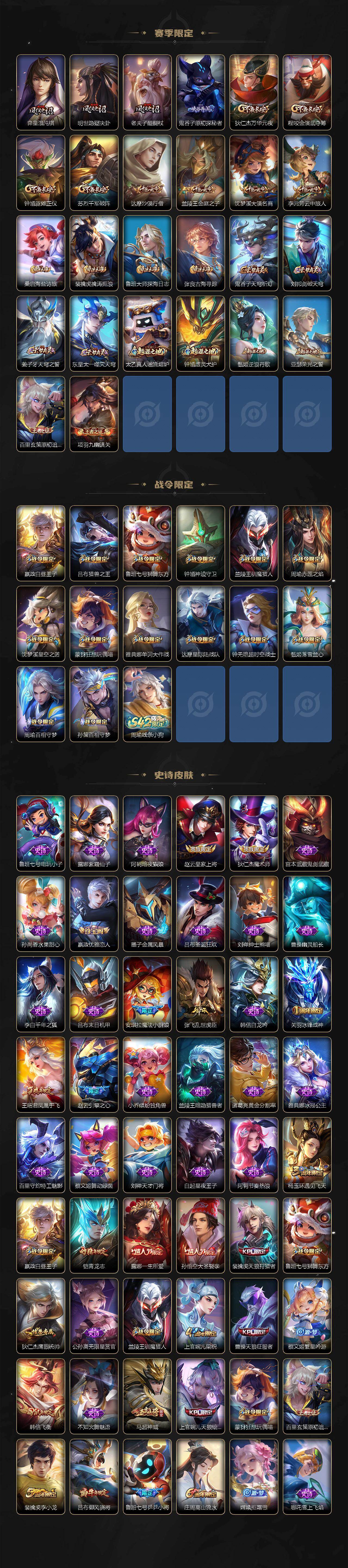 【限定皮肤】:姜子牙天穹之誓,狄仁杰阴阳师,赵云皇家上将,赵云引擎之心,嬴政优雅恋人,嬴政白昼王子,孙尚香异界灵契,鲁班七号狮舞东方,鲁班七号乒乒小将,庄周高山流水,钟无艳超时空战士