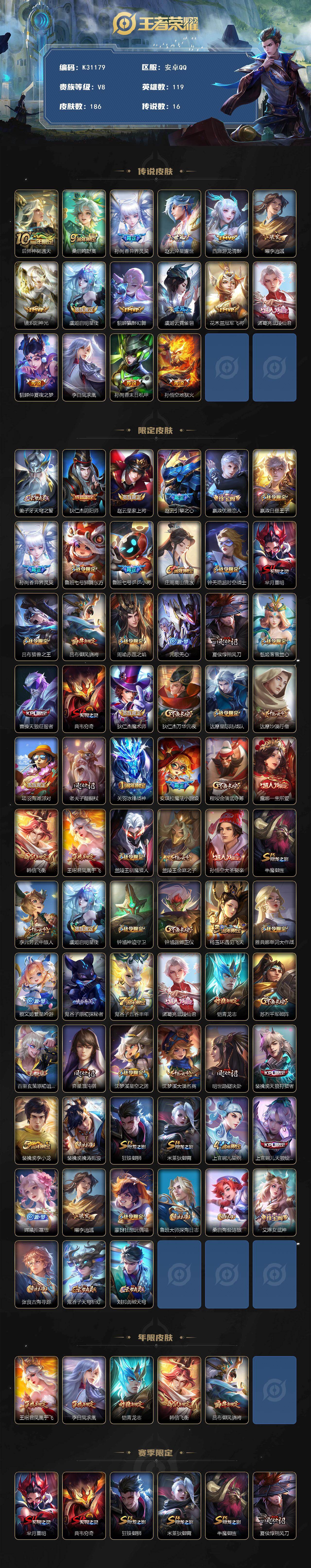 安卓Q-V8-永恒钻石III段位-119英雄-186皮肤-16传说-62史诗