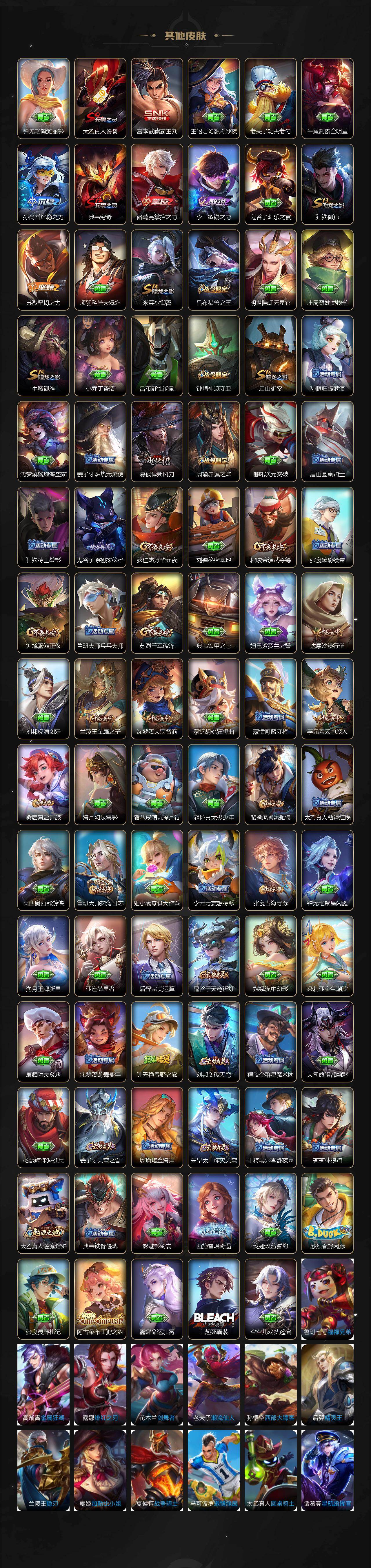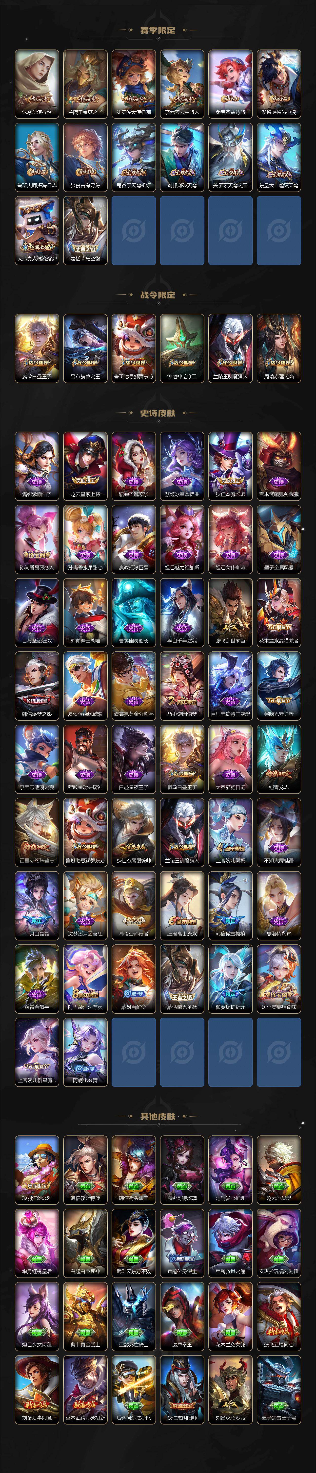 【限定皮肤】:姜子牙天穹之誓,杨戬破阵退雄兵,狄仁杰阴阳师,赵云皇家上将,嬴政白昼王子,孙尚香蔷薇恋人,孙尚香异界灵