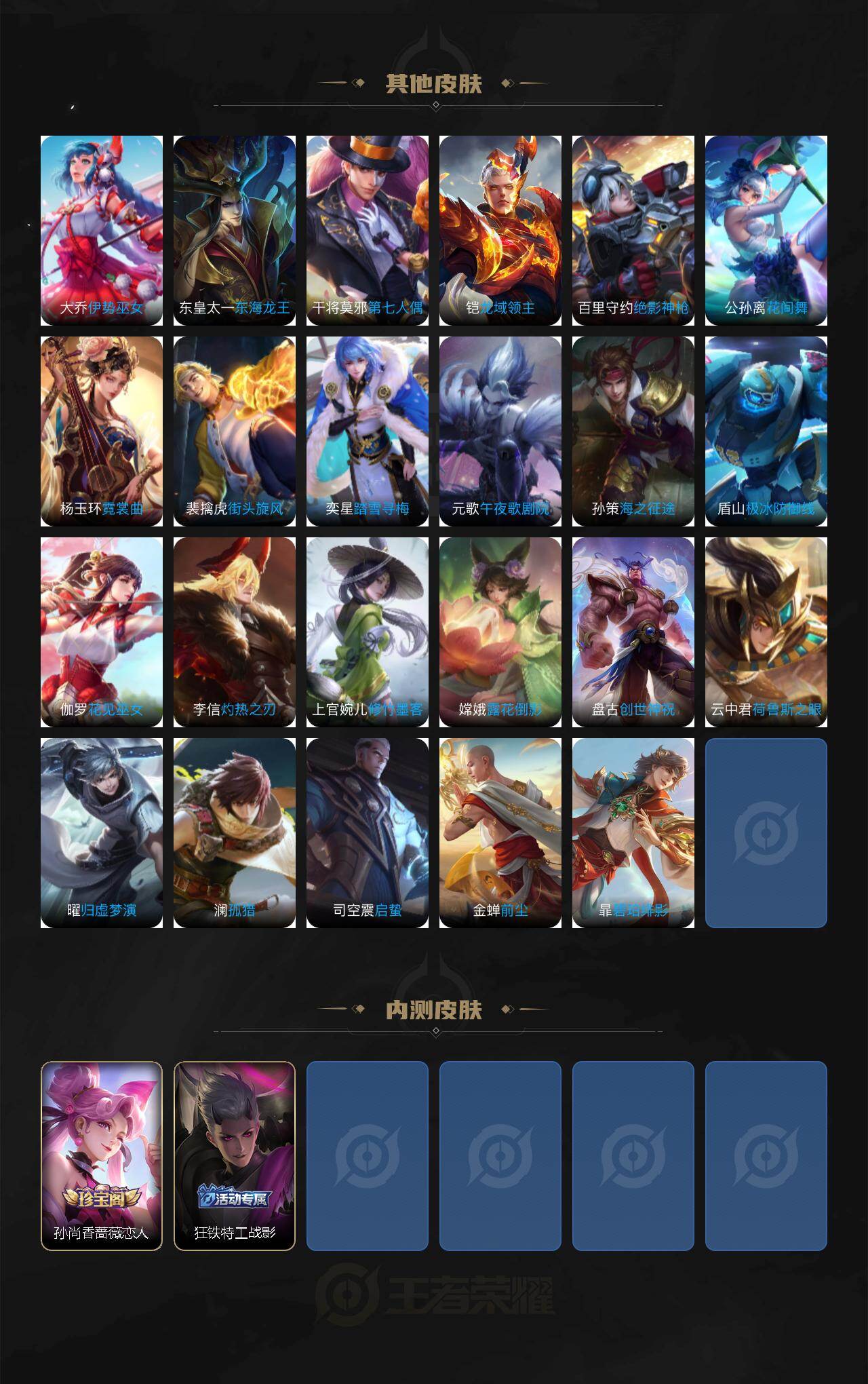 【传说皮肤】:桑启鸣野蒿,孙尚香乘龙问璇玑,李信山海炽霜斩,马可波罗深海之息,马超无双飞将,鲁班七号寅虎瑞焰,孙尚香异界灵契,赵云淬星耀世,西施游龙清影,李信一念神魔,貂蝉猫影幻舞,干将莫邪久胜战神,诸葛亮武陵仙君,狄仁杰超时空战士