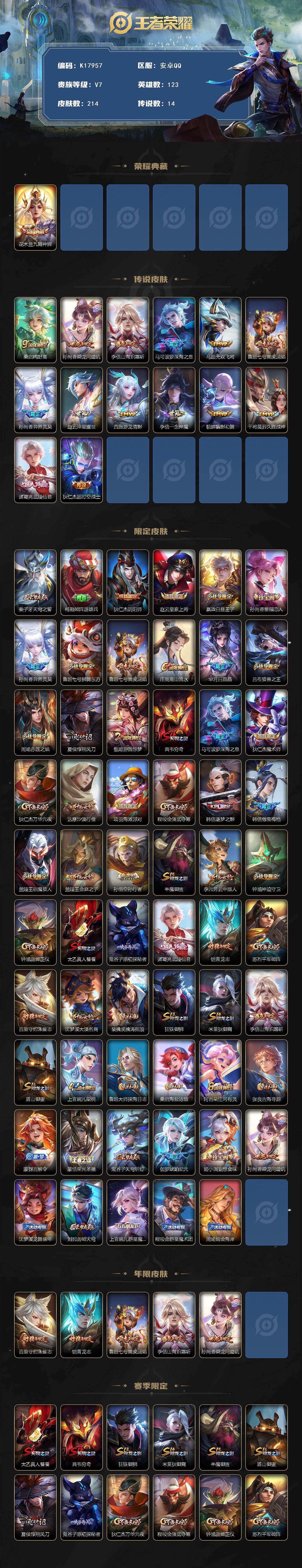 安卓Q-V7-至尊星耀V段位-123英雄-214皮肤-1典藏皮肤-14传说-50史诗